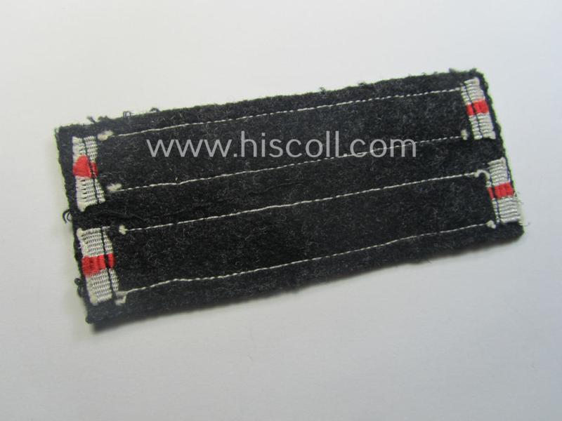 This is an attractive - and most certainly not that easily encountered! - typical DRK- (ie. 'Deutsches Rotes Kreuz-') related loyal-service-arm-patch (ie. 'Auszeichnungsborte des DRK') as was specifically intended to signify 25-years of loyal-service (ie.: '25-jährige Dienstzeit') and that comes in an overall very nice- (I deem issued- and/or used-), condition. The 'Borte' is constructed from a dual pair of typical silverish-toned (and braid-based) stripes that show a bright-red-toned centre-stripe and is (off-factory) sewn on a piece of black-toned wool (as to be expected). This neat DRK-insignia-piece was never before part of a collection and came as such from a private household in Germany. Simply an attractive DRK- (ie. 'Deutsches Rotes Kreuz'-) related loyal-service-arm-patch (ie. 'Auszeichnungsborte des DRK') as was specifically intended to signify 25-years of loyal-service (ie.: '25-jährige Dienstzeit') and that is I deem priced according to its comparative scarcity and/or desirability!