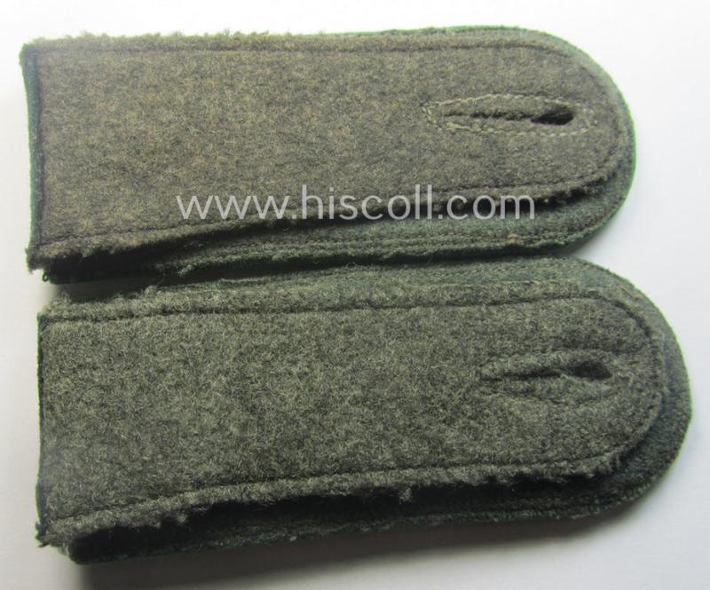 This is a truly atttractive - very desirable and fully matching! - pair of WH (Heeres) early- (ie. mid-) war-period, so-called: 'M40'-styled, NCO-type 'cyphered' shoulderstraps as piped in the typical darker-green- (ie. 'grüner'-) coloured branchcolour as was specifically intended for usage by - and clearly used by! - 'Feldwebel der Gebirgsjäger-Truppen u. Mitglied einer Gebirgsjägerschule' (or: sergeant and presumably trainer who served within a mountain-troops-related school) and that comes in an overall nice- (albeit moderately used and/or most certainly worn-), condition. The neat straps - which have the 'standard'-pattern, darker-green-coloured and/or woolen-based 'upperdecks' - have the neat darker-green- (ie. 'grüner'-) coloured and/or woolen-type-piping attached (as can be seen on the pictures). The straps measure approximately 11 cms. in length and are fully matching in style and/or execution: it deals with a typical, 'standard-issued'-pair that was always together as such. The straps (which come mounted onto their functional but I deem period-added tongues attached) have the 'standard'-pattern and/or silverish-grey-coloured (ie. somewhat sub-dued) WH 'Heeres'-type NCO-braid attached: furthermore, does the pair show a pair of identical (regular-sized- and/or aluminium-based) pips and a neat pair of (larger-sized, fully matching and also aluminium-based) so-called: 'S'-cyphers (ie. 'Ziffern') period-attached, denoting that the NCO who wore this set was an NCO ie. 'Feldwebel der Gebirgsjäger-Truppen u. Mitglied einer Gebirgsjägerschule'. All four devices show some minimal wear ie. are minimally tarnished. The pair was just moderately used and/or worn: it shows the evident age, wear and/or staining as to be expected. Simply a great occasion to acquire an attractive - and with certainty very desirable! - NCO-type, 'Gebirgsjäger'-related shoulderstrap-pair that belonged to a: 'Feldwebel der Gebirgsjäger-Truppen u. Mitglied einer Gebirgsjägerschule'!