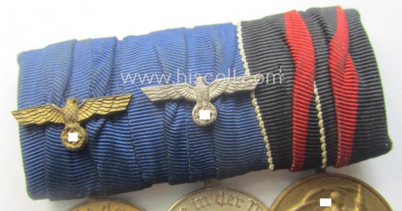 This is an attractive - just moderately used- and/or worn and is this combination not that often seen! - example of a (neatly detachable!) three-pieced medal-bar (ie. 'Ordenspange') that is respectively showing a: WH (Heeres or Kriegsmarine) so-called: 'Dienstauszeichnung für 12 Jahre Treue Dienste' (or: loyal-service medal for twelve years of loyal service), a: WH (Heeres or Kriegsmarine) so-called: 'Dienstauszeichnung für 4 Jahre Treue Dienste' (or: or loyal-service medal for 4 years of loyal service) and a: WH Czech-occupation- (ie. 'Anschluss'-) medal: '1. Oktober 1938' (that was awarded to all members of the armed forces that participated in the German occupation of Czechoslovakia that started on: '1. Oktober 1938'), all three awards coming in an overall nice- (and I deem just moderately used- and/or worn-), condition. All three awards are truly nicely preserved examples without showing any defaults that seem to have never been cleaned nor polished: they come in an equally minimally tarnished- ie. dusty (ie. used) condition and come naturally mounted onto their period ribbons. Both 'Dienstauszeichnungen für 12 u. 4 Jahre Treue Dienste' are both very nicely preserved examples retaining their golden- and/or silver-toned finish and do show their (period-attached) eagle-devices (as can be seen on the pictures). The 'Spange' comes period-mounted as a so-called: detachable 'Ordenspange' that is not 'backed' but typical chromed-steel-based (it retains its functional pin-ie. catch set-up). Simply an attractive and desirable 3-pieced 'Ordenspange' showing an unusual combination and that can be mounted onto almost any TR-period-tunic!
