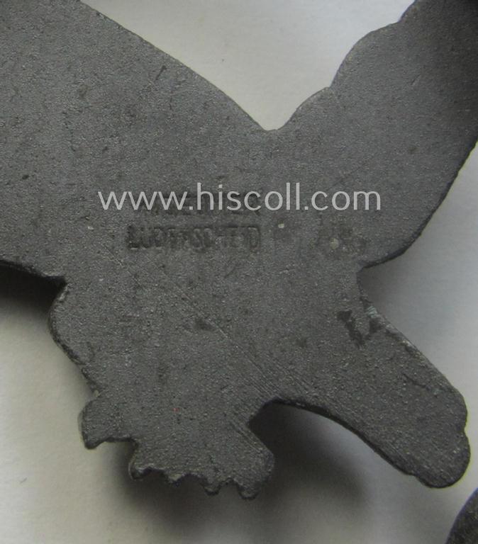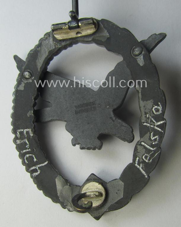 WH (Luftwaffe) 'Fliegerschützen-Abzeichen ohne Blitzbündel' being a neatly maker- (ie. 'Wilh. Deumer'-) marked- and/or: typical zinc- (ie. 'Feinzink'-) based example as was produced by the maker: 'Wilh. Deumer' and that shows a period-engraving