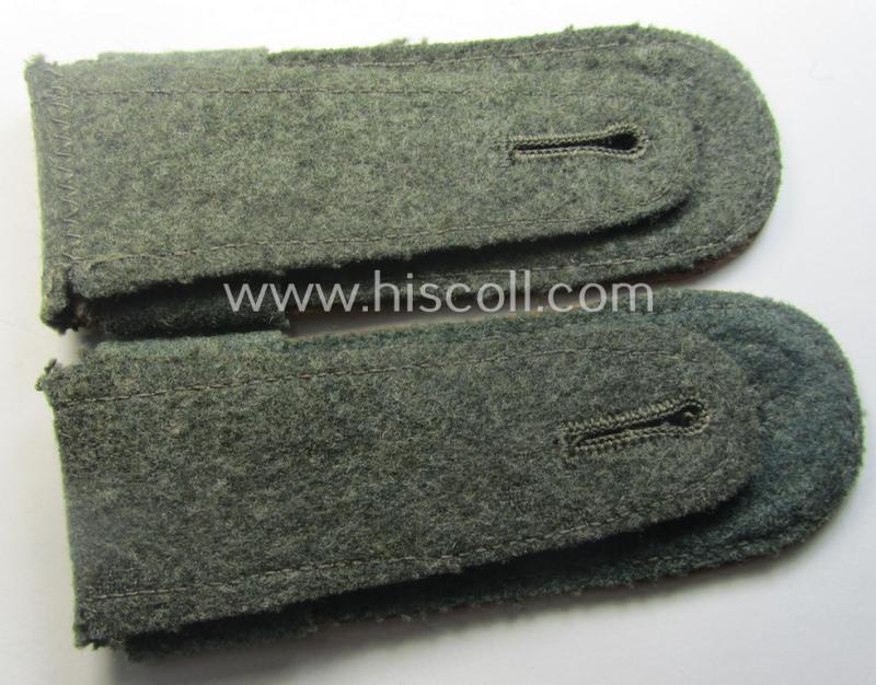 This is a truly very attractive - and actually rarely encountered! - pair of WH (Heeres), early- (ie. mid-) war-period- (ie. 'M41 o. M43'-pattern) enlisted-mens'-type shoulderstraps as piped in the desirable, copper-brown- (ie. 'kupferbrauner'-) coloured branchcolour as was intended for - and I deem just moderately used by! - a: Soldat des Kradschützen-Bataillons 12 der Pz.Div. u. Inf.Div. (mot)' (or: simple soldier who served within a tank- ie. infantry-related, motor-cycle unit, numbered: '12') and that comes in an overall very nice- (albeit just minimally used ie. worn-), condition. The straps - which I deem are of the early- (ie. mid-war-) period ie. so-called: 'M41 o. M43'-pattern - have the field-grey-coloured 'upperdecks' and have the neat, light copper-brown- (ie. 'kupferbrauner'-) coloured and/or desirable 'silk-like'-type piping attached (as can be seen on the pictures). The tongues are naturally also present. The straps - which are regular-sized and that measure 12,3 cms. in length each - come naturally mounted onto their functional tongues and came with a (also fully matching) pair of neat (field-grey-coloured- and/or woolen-based) so-called: shoulderstrap-slip-ons (ie. 'Schulterstück-Überschuben') attached bearing both the unit-designation: '12' (as executed in equally copper-brown-coloured, so-called: 'Kurbelstickerei' done in wool as can be seen on the pictures). Both the shoulderstraps and/or: 'Überschuben'-pair come in an overall very nice and/or fully undamaged condition (as can be seen on the pictures). This rarely seen pair originated from an older and extensive shoulderstrap-collection I recently acquired for the web-site. As possibly known, is this typical 'kupferbrauner'-branchcolour very rarely seen and can most certainly be regarded as one of the most rarely encountered branchcolours within the entire 'Deutsche Wehrmacht': original EM-type straps are almost never offered for sale and are missing in most shoulderstrap-collections. The pair on offer here just shows some minimal age, wear and or staining (as can be seen on the pictures). Simply a very attractive - and fully 'text-book'! - 'Kradschützen'-enlisted-mens'-shoulderstrap-pair that will be very hard to be upgraded and that does most certainly not come often for sale!