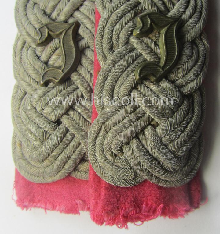 This is a truly very attractive - fully matching, truly used- and/or carefully tunic-removed and actually rarely encountered! - pair of WH (Heeres) 'cyphered', officers'-type shoulderboards as piped in the neat bright-pink (ie. 'rosaroter'-) coloured branchcolour as was specifically intended for usage by a: 'Major eines Panzer-Instandsetzungs-Abteilungs' (or: army-major who served within - ie. possibly commanded! - a panzer-repair regiment ie. unit) and that comes in an overall very nice- (ie. most certainly moderately used ie. worn-), condition. The neat shoulderboards - which measure approximately 11,5 cms. in length each - are executed in the 'smooth'-like-, bright-pink-coloured wool (aka: 'moleskin'-wool) and have silverish-grey-coloured (ie. somewhat 'sub-dued'-type) 'upperdecks' and come both without tongues attached: they were with certainty used as a pair of the 'sew-in'-pattern and do show some regular age, wear and/or staining (as can be noticed on the pictures). The boards show a pair of fully identical (tarnished golden-toned and larger-sized) Gothic-styled, capital 'I'-cyphers period-attached denoting the officers' rank ie. function of a: 'Major eines Panzer-Instandsetzungs-Abteilungs'. Both devices are just minimally tarnished and/or equally stained, simply caused by moderate wear and/or decades of storage. These 'standard-issue'-pattern, officers'-type shoulderboards could be used with the regular-style officers-tunics but could naturally also be worn on the specific, black-woolen 'Panzer' so-called: 'wrap-around'-tunics. Simply a very attractive - and actually rarely encountered! - 'Panzer'-related, officers'-type shoulderboard-set: only the first such rare pair in this particular rank I have ever encountered ie. offered for sale!