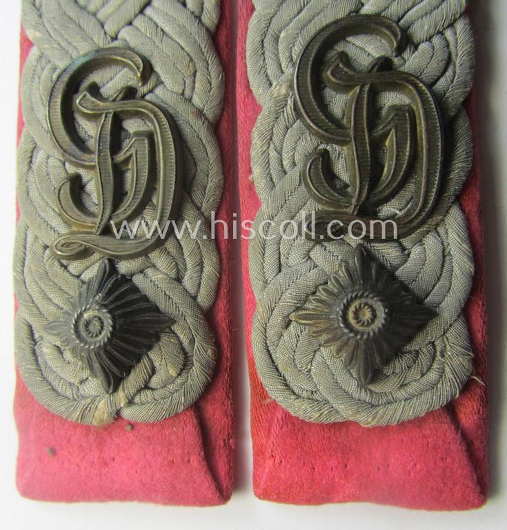 This is a truly very attractive - fully matching, truly used- and/or carefully tunic-removed and actually rarely encountered! - pair of WH (Heeres) 'cyphered', officers'-type shoulderboards as piped in the neat bright-pink (ie. 'rosaroter'-) coloured branchcolour as was specifically intended for usage by an: 'Oberstleutnant der Panzer-Truppen' who served within the famous 'GrossDeutschland'-Division (or: army lieutnant-colonel who served within - ie. possibly even commanded! - a panzer-related regiment ie. unit) and that comes in an overall very nice- (ie. most certainly moderately used ie. worn-), condition. The neat shoulderboards - which measure approximately 10,7 cms. in length each - are executed in the 'smooth'-like-, bright-pink-coloured wool (aka: 'moleskin'-wool) and have silverish-grey-coloured (ie. somewhat 'sub-dued'-type) 'upperdecks' and come both without tongues attached: they were with certainty used as a pair of the 'sew-in'-pattern and do show some regular age, wear and/or staining (as can be noticed on the pictures). The boards show a pair of fully identical (tarnished golden-toned and larger- ie. regular sized) Gothic-styled, capital 'GD'-cyphers and a pair of (equally styled and regular-sized) pips period-attached denoting the officers' rank ie. function of an: 'Oberstleutnant der Panzer-Truppen' who served within the famous 'GrossDeutschland'-Division. Both devices are just minimally tarnished and/or equally stained, simply caused by moderate wear and/or decades of storage. These 'standard-issue'-pattern, officers'-type shoulderboards could be used with the regular-style officers-tunics but could naturally also be worn on the specific, black-woolen 'Panzer' so-called: 'wrap-around'-tunics. Simply a very attractive - most certainly desirable and actually rarely encountered! - 'Panzer'-related, higher-ranked, officers'-type shoulderboard-set: only the first such rare pair in this particular rank I have ever encountered ie. offered for sale!