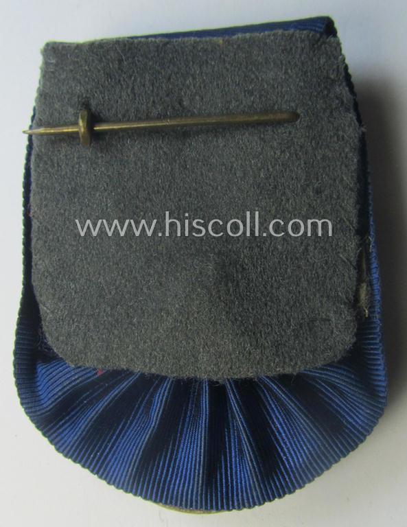 This is an attractive - and I deem just moderately used- and/or worn! - example of a minimally tarnished, (bright) silver-toned WH (Heeres o. Kriegsmarine) so-called: 'Einzelspange' (or: single-pieced medal-bar) showing a detailed: 'WH-Dienstauszeichnung 4. Stufe' (as was intended for 4 years of loyal-service) and that has a neat and pronounced (regular-sized) WH (Heeres o. Kriegsmarine) eagle-device period-attached and that comes mounted onto its confectioned, darker-blue- (ie. cornflower-blue-) coloured ribbon as issued and/or worn. The detail on this example is simply extraordinary: it has - I deem - never been cleaned nor polished and has an attractive and as stated above minimally tarnished) age-patina. The medal comes 'mounted' onto a metal-based clasp that is 'backed' with a piece of field-grey-coloured wool (and having a functional pin/catch-set-up) as was intended for wearing this example on a 'going-out'- ie. dress-tunic or 'Waffenrock'. This example truly retains gorgeous details and has a great age-patina: it retains most of its somewhat 'matted'- and/or: silver-toned finish without showing any defaults. The blue-coloured ribbon shows only minimal usage and/or staining. Simply an attractive WH (Heeres o. Kriegsmarine) example that comes mounted as an: 'Einzelspange'!