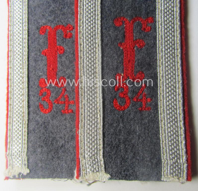 This is a truly attractive - fully matching and actually very scarcely seen! - pair of (I deem) pre-war-period and neatly 'cyphered', WH (Luftwaffe) NCO-type shoulderstraps as piped in the bright-red- (ie. 'hochroter'-) coloured branchcolour as was specifically intended for usage by an: 'Unterwachtmeister des Festungs-Flakartillerie-Abteilungs o. Regiments 34' (or: junior-sergeant who served within a specific fortress-anti-aircraft-unit, numbered: '34') and that comes in an overall nice- (ie. moderately worn- ie. clearly used- and/or carefully tunic-removed-), condition. The neat shoulderstraps - which measure approximately 11,8 cms. in length each - show the bright-red- (ie. 'hochroter'-) coloured branchcolour and have the woolen-type piping attached (as can be seen on the pictures). The straps that came without tongues were clearly used as a pair of the 'sew-in'-pattern (I deem that they were once attached to a so-called: 'Viertaschenrock'). They show - next to the 'standard'-pattern, silver-toned LW- ie. dotted-pattern NCO-braid - a pair of 'Gothic'-styled so-called: 'F'-cyphers (ie. 'Ziffern') and dito '3'- and/or '4'-numerals attached (which are executed in neat 'Kurbelstickerei' as to be expected) denoting that the pair was intended for usage by an: 'Unterwachtmeister des Festungs-Flakartillerie-Abteilungs o. Regiments 34'. The straps show some clear age, wear and/or staining and show some piping-damage on one of the straps (as can be noticed on the pictures). This pair originated from a larger cloth- and insignia-collection that I recently acquired for the web-site: it should, moreover, be noted that all 'cyphered' LW-straps are truly very hard to find. Simply a great occasion to acquire an attractive - and rarely seen! - NCO-type, LW-shoulderstrap-pair that was intended for an: 'Unterwachtmeister des Festungs-Flakartillerie-Abteilungs o. Regiments 34'!