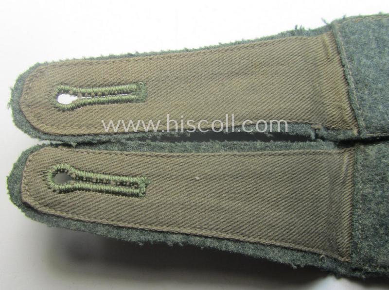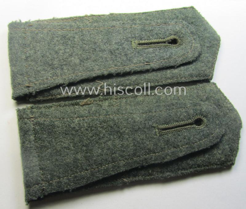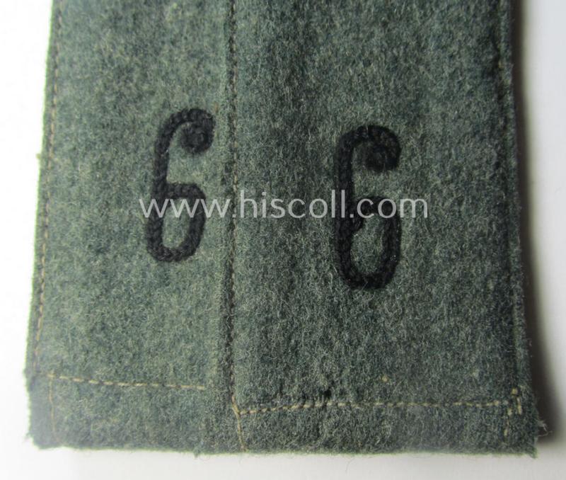 This is an attractive - fully matching and actually fairly rarely encountered! - pair of (I deem) early-period (ie. 'Reichswehr'-era and/or 'pointed-styled' ), WH (Heeres) 'cyphered' enlisted-mens'-type shoulderstraps (being of the generic-pattern having no piping attached as per regulation) as executed in the neat field-grey-coloured-wool as was specifically intended for - and with certainty used by! - a: 'Soldat des Pionier-Regiments 6' (or: simple soldier who served within the engineers-regiment, numbered: '6') and that comes in an overall very nice- (albeit just moderately used ie. worn-), condition. The straps - which measure 11,6 cms. in length each - are fully 'text-book' in all facets and are executed in (typical 'Reichwehr'-era pattern!) wool and having no piping attached. The straps come naturally mounted onto their functional, tongues attached: moreover, do they show the black-coloured '6'-cyphers (ie. numerals or: 'Ziffern') which are executed in so-called: 'Kurbelstickerei' as to be expected (as can be seen on the pictures). These type of (early) shoulderstraps are of the pre- ie. early-war-period pattern straps and were (I deem) worn in the period around 1935/1937 and were worn-out during the war. The pair only shows moderate wear and/or age and is just nicely preserved over the years (as can be seen on the pictures). Simply an attractive - and with certainty quite rarely encountered! - 'cyphered' shoulderstrap-pair that belonged to a: 'Soldat des Pionier-Regiments 6' and that is (I deem) accordingly priced!