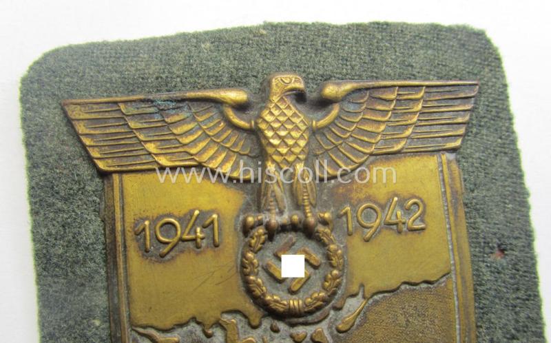 This is an attractive - and in this 'virtually mint' condition quite scarcely found! - example of a: WH (Heeres ie. Waffen-SS) 'Krim'-campaign-shield as was produced by a (by me) unidentified maker and that comes in a presumably issued- (albeit I deem simply never used- nor worn- ie. still 'virtually mint'-), condition. The shield - that comes mounted onto its original, field-grey-coloured 'backing' - comes in a truly wonderful condition and was with certainty never used- nor tunic-mounted. It comes naturally complete with its metal-based back-plate and has all its four prongs in place: moreover, does it still retain its (typical) protective, reddish-beige-coloured- and/or paper- (ie. carton-) based backing attached (as can be seen on the pictures). The shield - which is minimally converse-shaped as more often - retains almost all of its original, neatly golden-bronze-coloured finish ie. golden-bronze-like appearance (most of its period 'Brennlack' is still present!) and was never cleaned nor polished: it does show some minimal staining caused by decades of storage only. Simply a very attractive and desirable 'Heeres ie. Waffen-SS'-pattern example that will be very hard to upgrade. It should be noted that these 'almost minty' examples are very hard to come by: it will be very diffucult to upgrade this totally untouched specimen!