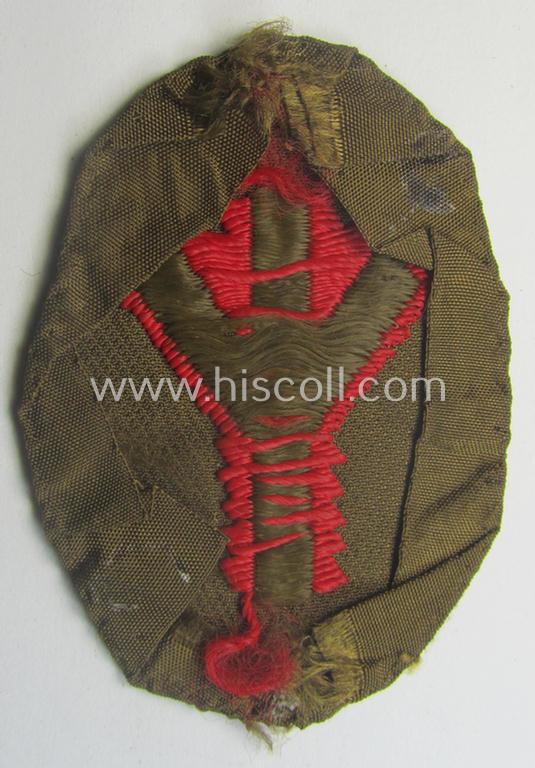 This is an attractive - truly used- and/or shirt- ie. tunic-removed example of an: SA (ie. 'Sturmabteilungen') so-called: trade- or specialist-armbadge (ie. 'SA-Tätigkeits-Abzeichen') as executed in neat 'BeVo'-weave pattern as was specifically intended for usage by a: 'Sanitäts-Unterführer o. Mann' (ie. 'SA-Feldscher' or medical orderly) that comes in an overall nice- (ie. truly used- and/or shirt-removed -), condition. The neat badge - only approximately sized: 6 x 4,5 cms. - was neatly folded and confectioned. It can, however, still easily be mounted onto a tunic or shirt if wished so. The piece comes without an 'RzM'-etiket: this was most likely once present but was lost over the years (as can be seen on the pictures). Simply a nice occasion to acquire a neat - and fairly unusally encountered! - SA (ie. 'Sturmabteilungen') cloth-based speciality-patch (ie. 'SA -Tätigkeits-Abzeichen') for a competitive price!