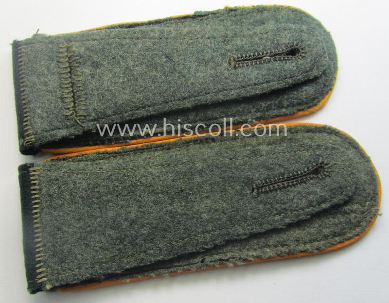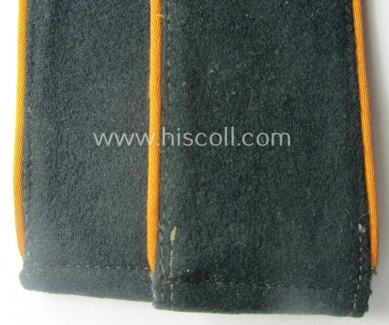 This is an attractive - fully matching and (I deem) early-war-period - pair of 'standard-issued'-pattern, WH (Heeres) early- ie. pre-war period- (ie. 'M40'-pattern), enlisted-mens'-type shoulderstraps (ie. 'Schulterstücke für Mannschaften des Heeres') as was piped in the desirable golden-yellow- (ie. 'goldgelbener'-) coloured branchcolour as was specifically intended for usage by a: 'Soldat eines Kavallerie- o. Reiter-Regiments' (or: simple soldier who served within one of the cavalry regiments) and that comes in an overall nice- (ie. I deem just moderately used- ie. worn-), condition. The neat straps - which have the 'standard'-pattern, darker-green-coloured and/or typical 'smooth woolen'-based 'upperdecks' and that measure approximately 12 cms. in length each - show the neat golden-yellow- (ie. 'goldgelbener'-) coloured and desirable 'silk-like'-type piping attached (as can be seen on the pictures). The pair comes naturally mounted onto their period-attached- (regular-shaped) tongues attached and comes in a very nice- (ie. fully 'text-book') condition overall (as can be seen on the pictures). These type of shoulderstraps are of the fairly early-war-period pattern straps and were worn in the period around 1939/1940 (and were 'worn-out' even during the rest of the war). The pair only shows minimal wear and/or age and is just nicely preserved over the years (as can be seen on the pictures). Of additional interest is, moreover, the fact that one of the straps shows a 'period-attached' button-hole in its tongue: I deem that was done in order to accomodate a (shooting)lanyard. I deem this an excellent occasion to acquire a neat - and most certainly desirable! - EM-type, 'Kavallerie o. Reiter'-related, Heeres-EM-type shoulderstrap-pair for a justified price!