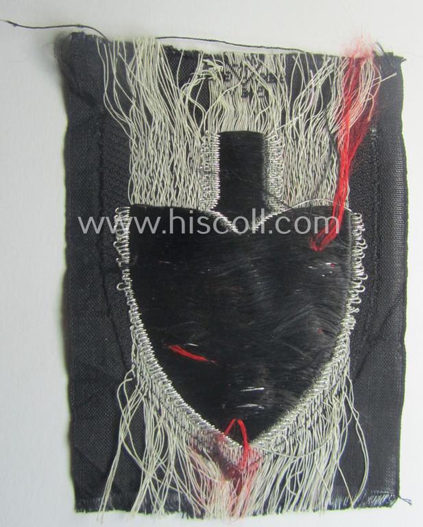 This is an attractive - and actually not that easily encountered! - officers'-version of a so-called: RAD (ie. 'Reichsarbeitsdienst') sleeve-badge (or: 'Dienststellen-Abzeichen für Offiziere des Reichsarbeitsdienstes') bearing the specialist- ie. unit-unit-designation: '242/8' (as was presumably intended for a RAD senior-official who served within the 242nd district ie. 'Bezirk') and that comes in an overall very nice- (ie. simply never used- nor tunic-attached- ie. 'virtually mint- ie. unissued'-), condition. These attractive arm-badges were worn on the upper left sleeve of the mustard-coloured (officers'-type-) RAD-tunics and/or garments. The badge - which shows the red-coloured '242/8'-numerals - is neatly executed in so-called 'flat-wire'-like 'BeVo'-weave technique and was as such intended for an officer who served within the 297th district ie. 'Bezirk'. The piece was never folded nor trimmed and originates from a smaller collection of rarely seen RAD cloth-insignia I recently acquired for the web-site. Of additional interest is, moreover, the interwoven makers'-designation (which is visible on its top). It should be noted that all RAD officers'-type badges are comparatively scarcely encountered!