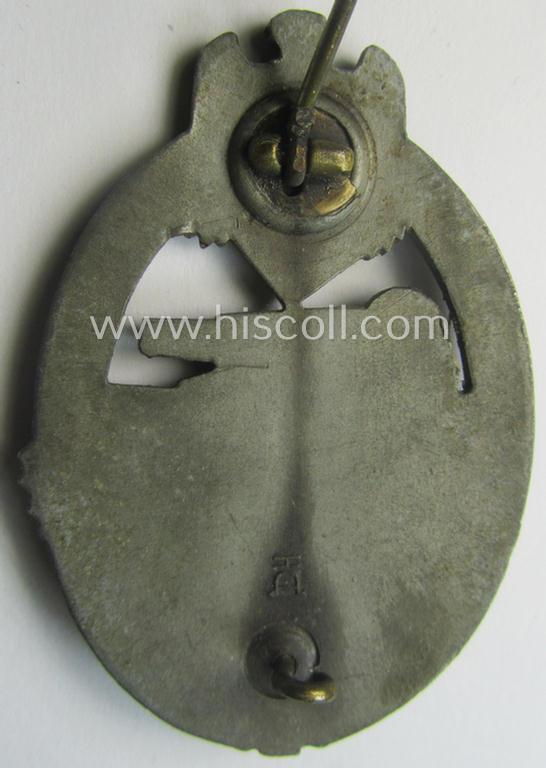 This is a very attractive - albeit surely issued- and/or moderately used- and/or worn but nevertheless not that easily encountered! - example of a detailed: 'Panzerkampfabzeichen in Bronze' (or: bronze-class panzer-assault-badge ie. PAB) being a neatly maker- (ie. 'HA'-) marked- and/or (typical) zinc- (ie. 'Feinzink'-) based specimen that was produced by the desirable maker: 'Hermann Aurich' as was based in the town of Dresden and that comes in an overall very nice- (albeit issued- and/or I deem moderately worn-), condition. The badge on offer here concerns a (I deem somewhat later-war-period) zinc- ie. 'Feinzink'-based specimen that truly retains most of its somewhat light-toned, bronze-coloured finish and that has maintained an attractive appearance, still showing pronounced detail as to be expected. The badge was with certainty never cleaned nor polished (and is still also a tiny bit dirty ie. stained- ie. tarnished as mentioned above). As stated above, does it deal with a so-called: 'Hermann Aurich - solid zinc'-pattern (as is uniquely numbered with the reference-number: '1.8.1.' according to the excellent reference-work entitled: 'The Panzer-Assault badge of WWII' by my Belgian friend Philippe de Bock). The neat piece naturally shows all the details as to be expected for a badge by this particular maker. The badge was recently found at a private-household in Germany and was never before in collectors-hands. Simply a nice and honest bronze-class, so-called: 'Hermann Aurich'-pattern PAB that comes in an overall very nice, albeit moderately used and/or worn, condition!