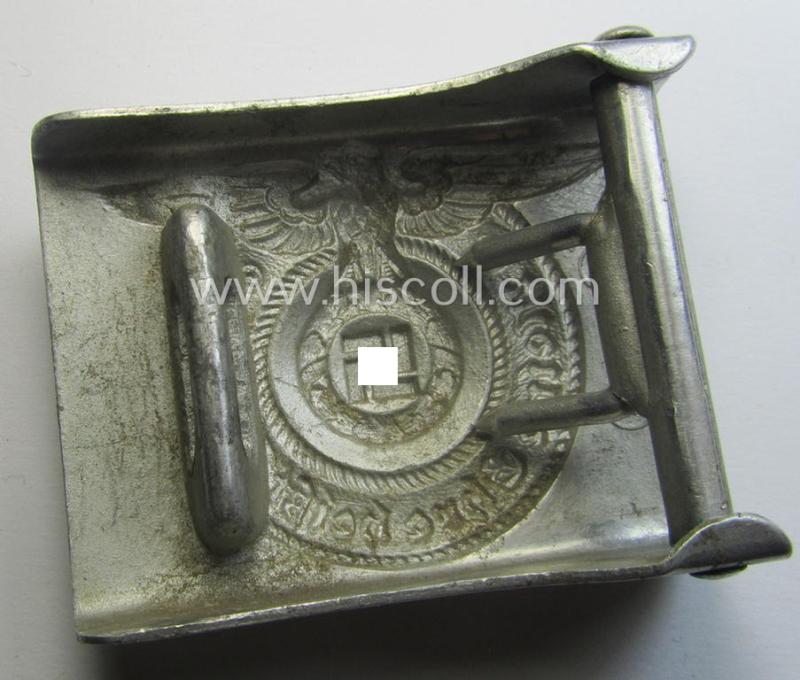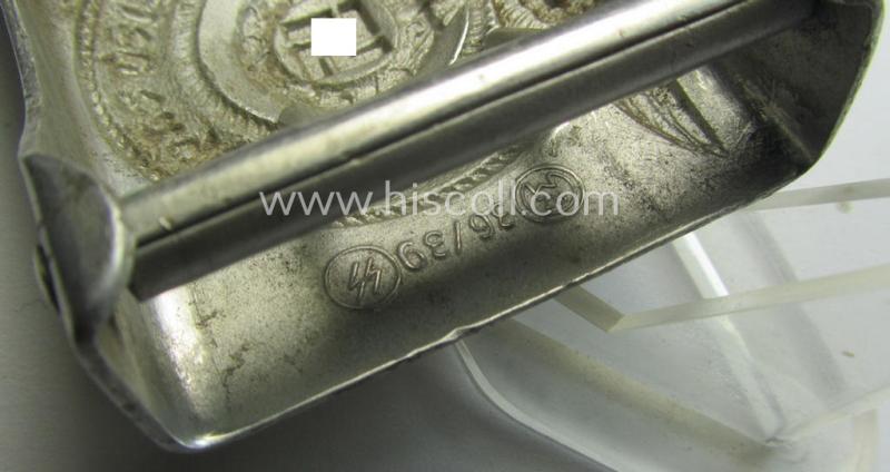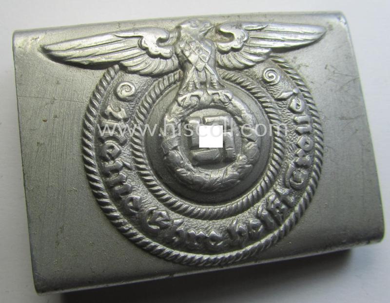 SS- (ie. Waffen-SS), aluminium-based, enlisted-mens'- (ie. NCO-type-) belt-buckle being a neatly maker- (ie. 'RzM - 36/39 - SS'-) marked example that comes in a just moderately used- ie. worn, condition