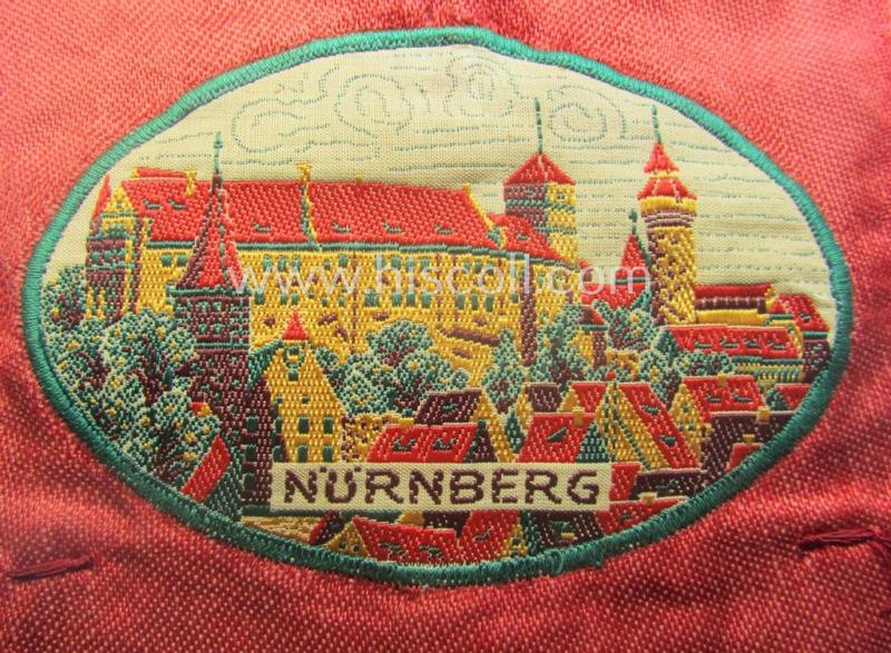 The neat - medium- (ie. somewhat smaller-) sized flag - which measures from top to point approximately 18,5 cms. and that is approximately 12,5 cms. wide - is nicely constructed from (I deem minimally sun-faded) bright-red-coloured linnen and shows one side an interwoven and bright-green rimmed (and multi-coloured) illustration of three men holding a statue of a 'Reichsadler'-device coupled with the text: 'Reichsparteitag 1937' (and as such showing the device that was specifically designed for usage for this annual party-rally) and on the other side an (equally nicely woven) patch showing a towns'-view of the city of Nürnberg. The decorative 'Fahne' is (I deem) just moderately used and does show some minimal age and/or staining caused by slight usage and/or decades of storage (it is however totally void of any real damage or alike as can be seen on the pictures). The neat piece is 'double-sided' still shows its 'attachment-construction' in place (intended to attach it to a bicycle or vehicle or alike). Of additional interest is, moreover, the fact that this example shows four period-attached Laschen (which are I deem there to place two 'tinnies (or 'Veranstaltungsabzeichen') from this particular party-meeting. I am convinced that this is a quite scarcely encountered party-related item that did not saw wide-spread usage and that is with certainty accordingly priced!