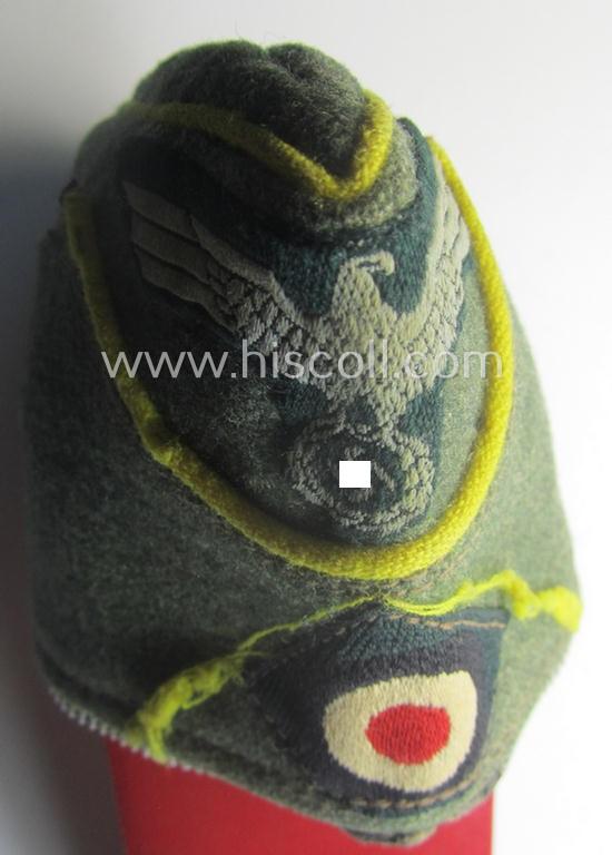 This is an interesting - most certainly not that often seen, smaller-sized- and with certainty period! - wallet (ie. 'Geldbörse') takes the format of a smaller-sized (ie. measuring approx. 11,8 x 8 cms.) WH (Heeres) ie. 'Nachrichten'- (or signals) related side-cap (ie. 'Schiffchenmütze') and that comes in an overall nice- (and only moderately used-), condition. The souvenir-side-cap (ie. 'Schiffchenmütze') is entirely constructed from field-grey-coloured wool as its regular-sized counterparts and shows the bright-yellow- (ie. 'zitronengelber'-) toned piping (ie. 'Waffenfarbe' or branchcolour): moreover, does it show an equally coloured 'Soutache-Winkel' (which shows some wear as can be noticed on the pictures). The piece shows a (matching) set of side-cap-insignia period-attached (by means of machine-stitching) and comes with its (non-functional ie. broken) zip-closure (of the make: 'Zipp'). This interesting smaller-sized souvenir-item was recently found as such at a German private-household and was stored as such for decades. Simply a neat - and most certainly not that often seen! - period 'souvenir-item' that is I deem, accordingly priced!