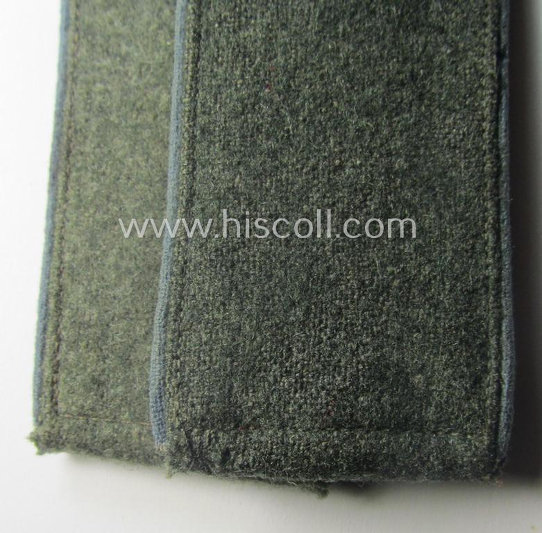 This is an attractive - regrettably slightly mis-matched but nevertheless not that easily encountered! - (I deem) early- (ie. mid-) war-period, so-called: 'M40 o. M43'-pattern, WH (Heeres) enlisted-mens'-type shoulderstrap-pair as was piped in the neat light-blue- (ie. 'kornblumenblauer'-) coloured branchcolour as was specifically intended for usage by a: 'Soldat der Nachschub-Truppen' (or: simple soldier and presumably a driver who served within the army transport-troops) and that comes in an overall nice- (and I deem just moderately used- and/or worn-), condition. The shoulderstraps - which measure approximately 11 cms. in length each as more often seen - have the woolen-type piping attached (as is more encountered with these early- ie. mid-war-period shoulderstraps). The shoulderstraps - which originates from a larger cloth- and insignia-collection I recently acquired for the web-site - come naturally mounted onto their functional tongues (as can be noticed on the pictures): although they differ slightly in style and/or execution I have no doubt that thet were worn as such as a pair. Simply an attractive - and/or fully 'text-book'! - 'M40- ie. 43'-pattern, EM-type 'Nachschub'-shoulderstrap-pair that was intended for usage by a: 'Soldat der Nachschub-Truppen' and that I have priced according to its mis-matched condition!