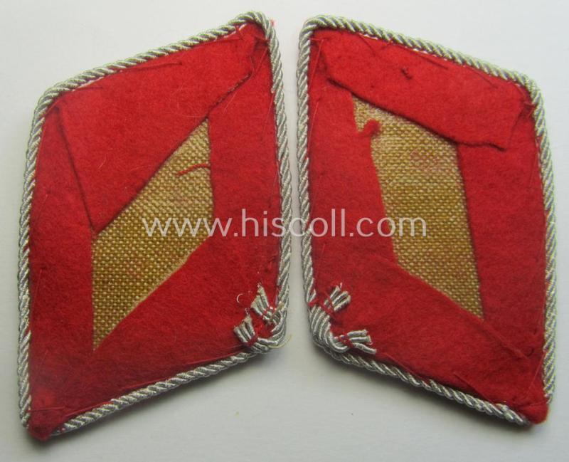 This is an attractive - fully matching and actually not that easily found! - pair of neatly hand-embroidered, WH (Luftwaffe) officers'-type collar-patches (ie. 'Kragenspiegel für Offiziere der Luftwaffe') as was executed in the bright-red- (ie. 'hochroter'-) coloured and/or: typical smooth- (ie. 'moleskin'-) type wool as was specifically intended for usage by a fairly high-placed LW-officer ie. having the rank of an: 'Oberstleutnant der Flak-Artillerie-Truppen' (or: air-force lieutnant-colonel who served within ie. even commanded an anti-aircraft, artillery-unit) and that comes in an overall very nice- (ie. surely issued- and I deem once tunic-attached and/or carefully tunic-removed), condition. The pair is neatly hand-embroidered and shows great detail and/or craftmenship (as can be seen on the pictures). Both pieces have a 'standard-type', beige-coloured- and/or 'buckram'-based 'backing' (as can be noticed on the pictures). Simply an attractive - and with certainty not that easily encountered! - pair of high-ranked LW officers'-type collar-tabs for an: 'Oberstleutnant der Flak-Artillerie-Truppen' that is I deem accordingly priced!