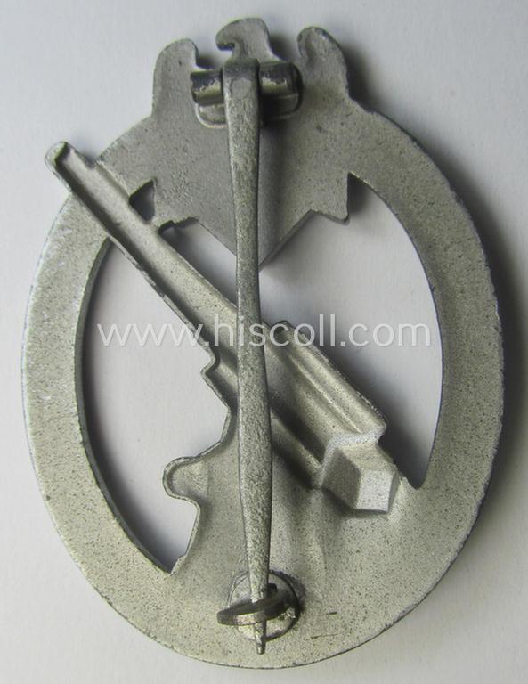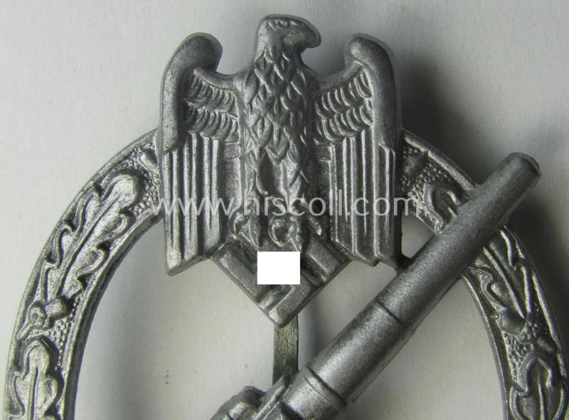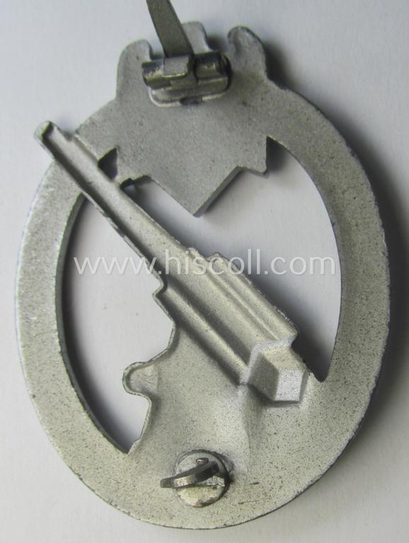 This is a very attractive - and actually quite rarely encountered! - example of a so-called: 'Heeres-Flakkampf-Abzeichen' (or: army anti-aircraft war-badge) being a (typical) non-maker-marked- and/or zinc- (ie. 'Feinzink'-) based specimen as was with certainty produced by the desirable maker (ie. 'Hersteller') named: 'Förster & Barth' as was based in the town of Pforzheim and that comes in an overall very nice- (ie. I deem hardly used- nor worn- ie. still 'virtually mint'), condition. The badge on offer here concerns a somewhat later-war-period, typical zinc- ie. 'Feinzink'-based specimen that retains most (ie. all!) of its (fairly shiny!) silver-coloured finish and has maintained an attractive appearance, still showing pronounced detail as to be expected. The badge - that shows the typical- and totally unaltered 'hardware' ie. pin-/pin/catch-set-up as encountered for this maker - has simply never been cleaned nor polished (and is still also a tiny bit dirty ie. stained- ie. tarnished as mentioned above). (As stated above, does it deal with a so-called: 'non-marked-marked'-pattern that naturally shows all the details as to be expected for a badge by this particular maker: these 'Heeres-Flakkampf-Abzeichen' by this maker are sometimes marked with the LDO-designation: 'L/21' on the back of their pin). Simply a very attractive and honest 'Heeres-Flakkampf-Abzeichen' by the desirable maker (ie. 'Hersteller') named: 'Förster & Barth' and that comes in an overall very nice condition: it will be very hard to upgrade this superb specimen!