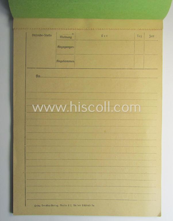 This is a neat - surely desirable and complete! - WH (Heeres ie. Luftwaffe etc.) 'Dienst'-related 'notebook' (ie. entitled: 'Meldeblock') as was published by the famous 'Heinz Denckler Verlag' as was based in Berlin and holding various blank pages (ie. forms) as was intended for storage in the 'Kartentasche' (or: map-case) and that comes in a hardly used, condition. The 'notebook' measures 21 x 15 cms. and holds approximately 25 examples of pages ie. forms (as can be seen on the pictures). The neat piece comes in a wonderful condition and is just a tiny bit yellowed- ie. stained due to decades of storage only: it was once used as a note-book and does show some notes (I deem pre-war-done). Simply an attractive accesory that can excellently be used for storage into any WH-map-case (ie. 'Kartentasche'): ideal for any mannequin set-up. Incredible that such a fragile item was kept in such untouched condition for all those years!