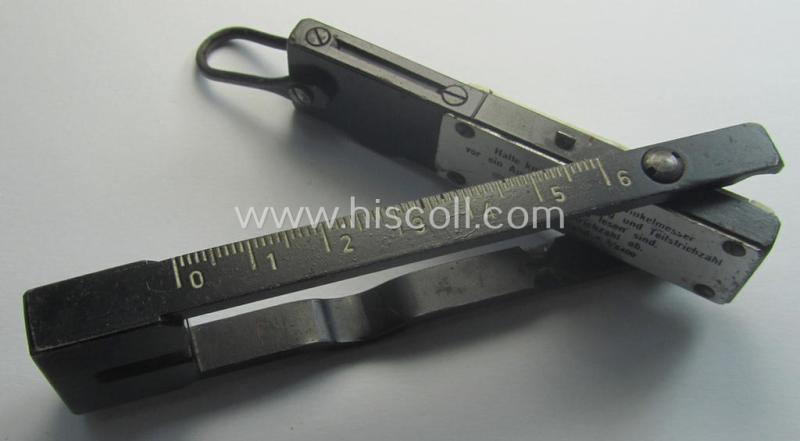 This is a neat - very desirable and with certainty not that easily encountered! - 'high-quality'-produced WH equipment-item, being a so-called: 'Deckungswinkelmessgerät H/6400' (or: angle-measuring-device as was used by amongst others the artillery-troops) being a neatly maker- (ie. 'DHQ'-) marked example that bears an unique serial-number: '119505' and that comes in an overall nicely preserved- and I deem only moderately used, condition. The piece retains almost all of its bluish-black-coloured finish (something that is most certainly not always the case) and retains a fully preserved 'text-decal' and white-toned, resin-based 'end-part' that shows some handling-instructions (as can be seen on the pictures). The piece is still fully functional and of course complete. These precision-instruments were normally stored in the various map-cases and saw wide-spread usage throughout WWII. This example was made by the maker (ie. 'Hersteller') named: 'J.D. Moeller G.m.b.H.' as was based in the town of Wedel (Holst.). I deem that I have priced this desirable equipment-item accordingly!
