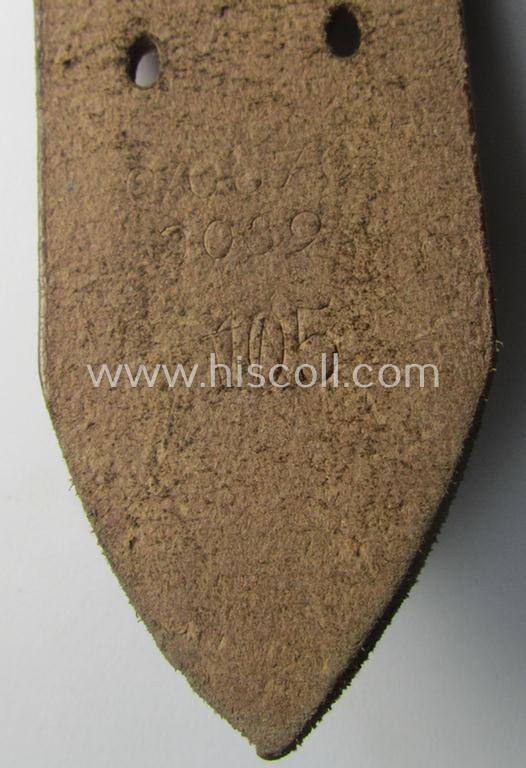 This is a truly very attractive - and I deem hardly used- nor worn! - WH (Heeres-, Luftwaffe ie. Waffen-SS) reddish-brown-coloured- and/or genuine-leather-based so-called: officers'-type-belt (ie. 'Zweidornschnalle für Offiziere') being a wonderfully preserved example that is approximately 100 cms. sized in length (and having a width of approximately 4,5 cms.) and that is totally void of a makers'-designation and that comes in an overall very nice- (ie. I deem issued- albeit hardly used- nor worn-), condition. The piece is naturally still fully souple and of course fully functional. The 'pebbled'-styled, silverish-grey-toned buckle measures approximately 6,2 x 4,8 cms. (and that is void of a makers'-designation as can be noticed on the pictures). The buckle truly retains all of its silverish-coloured finish (as can be seen on the pictures). The piece - that shows an impressed makers'-designation (which is hard to decypher), date: '1939' and/or size-stamp ('105') on its back that reads '105' - comes naturally complete with its (often missing!) 'Lasche' (as can be seen on the pictures). It should be noted that this naturally a genuine, WWII-period example and NOT a post-war piece or alike. Simply a very attractive, standard-issue-pattern, 'officers'-type-belt ie. 'Zweidornschnalle für Offiziere' that comes in a wonderful condition: great to use on any mannequin or equipment-set-up!