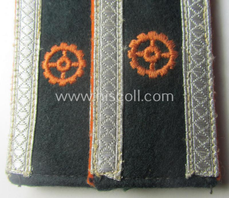 This is an attractive - just moderately used and/or fully matching! - pair of typical tailor-made- (ie. I deem privately-purchased-) pattern, WH (Heeres) early-war period- (ie. 'M40'-pattern and/or: rounded-styled) NCO-type shoulderstraps (ie. 'Schulterstücke für Unteroffiziere des Heeres') as was piped in the desirable bright-orange- (ie. 'orangeroter'-) coloured branchcolour as was specifically intended for usage by an: 'Unteroffizier eines Feld-Ingenieur-Abteilungs des Heeres' (or: junior-sergeant who served within an army enigineer-related unit) and that comes in an overall nice- (ie. just moderately used- ie. worn-), condition. The neat straps - which have the 'standard'-pattern, darker-green-coloured- and/or typical 'smooth woolen'-based 'upperdecks' and that measure approximately 10,7 cms. in length each - show the neat bright-orange- (ie. 'orangeroter'-) coloured and/or woolen-type piping attached (as can be seen on the pictures). Both straps show a so-called: 'Zahnrad'-cypher (ie. cogwheel 'Ziffer') attached (which are executed in orange-toned- and machine-embroidered linnen. The straps - that came with a pair of silver-toned tunic-buttons attached - show, moreover, the typical silverish-toned NCO-braid attached denoting the NCOs-rank of an: 'Unteroffizier'. The pair comes mounted onto their period (smaller-sized) tongues and comes in an overall nice- and/or just moderately used condition (as can be seen on the pictures). Simply an excellent occasion to acquire a neat NCO-type, 'Feld-Ingenieur des Heeres'-related shoulderstrap-pair for an I deem justified price!