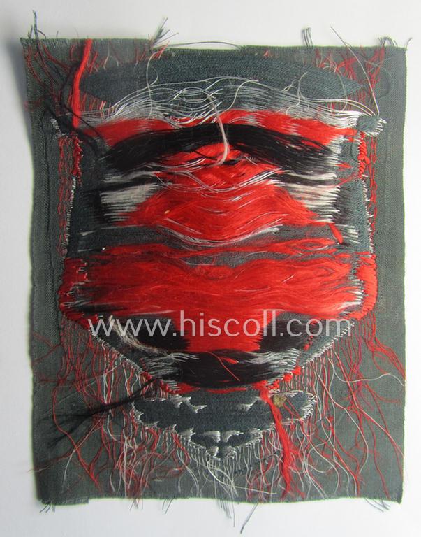 This is a truly very attractive - and actually scarcely encountered! - WH (Heeres), typical flat-wire- (ie. 'BeVo'-) woven so-called: 'Ärmelabzeichen für Fahnenträger des Heeres' (or: army flag-bearers' arm-badge) as was piped in the neat bright-red- (ie. 'hochroter'-) branchcolour as was intended for usage by a soldier (ie. NCO) who served within an army: '(Sturm)Artillerie'- (ie. artillerie-) unit and that comes in an overall very nice- (ie. I deem issued albeit still 'virtualy mint'- and/or simply never tunic-attached-), condition. The arm-badge is very nicely woven in the so-called: 'flat-wire' 'BeVo'-woven technique and is truly a superb example of this fantastic technique. The badge comes in a totally unconfectioned- ie. 'virtually mint' condition and will be impossible to be upgraded. It should be noted that I have seen similar examples being offered for much more than my asking-price!