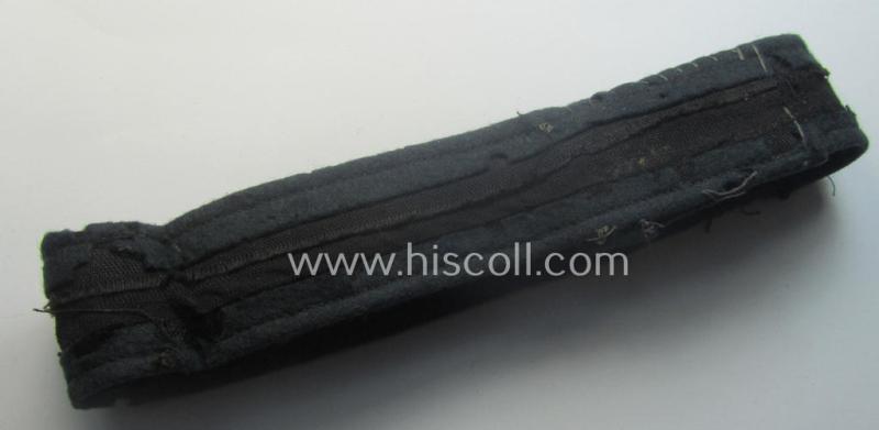 This is an attractive - somewhat moth-damaged but nevertheless actually scarcely found! - example of a WH (Luftwaffe) cuff-title ie. armband (ie. 'Ärmelstreifen') entitled: 'General Göring' being a typical, machine-embroidered enlisted-mens'- (ie. NCO-) pattern example that comes in a clearly issued- ie. worn- and/or period-shortened- ie. carefully tunic-removed-, condition. The armband comes - as stated above - in a just minimally shortened condition and was clearly used as such (ie. it came still 'sewn-together' as worn and measures folded approximately 36 cms. in length). Both ends are unfinished (but were folded) as is more often encountered (as can be seen on the pictures). The armband - which originates from a private-household in Germany where it was recently uncovered shows moderate age, wear and or staining and was as such most certainly issued- and/or stored as such for decades: it still shows some of it stitching-remains with which it was once tunic-attached (as can be noticed on the pictures). The cuff-title is executed in darker-blue-coloured ('smooth'-type) wool and shows the (very detailed!) hand-embroidered title 'General Göring' in white-coloured linnen as is more often encountered. It deals with a typical (quite early-period) example that was intended for mere enlisted-mens'- and/or NCO-usage ie.: 'Ausführung für Mannschaften u. Unteroffiziere der Luftwaffe'. Simply anattractive - and naturally genuine period and truly worn! - example that was issued to a member serving within a famous 'LW-unit' and that is priced according to its fully untouched - albeit regrettably relic! - condition!