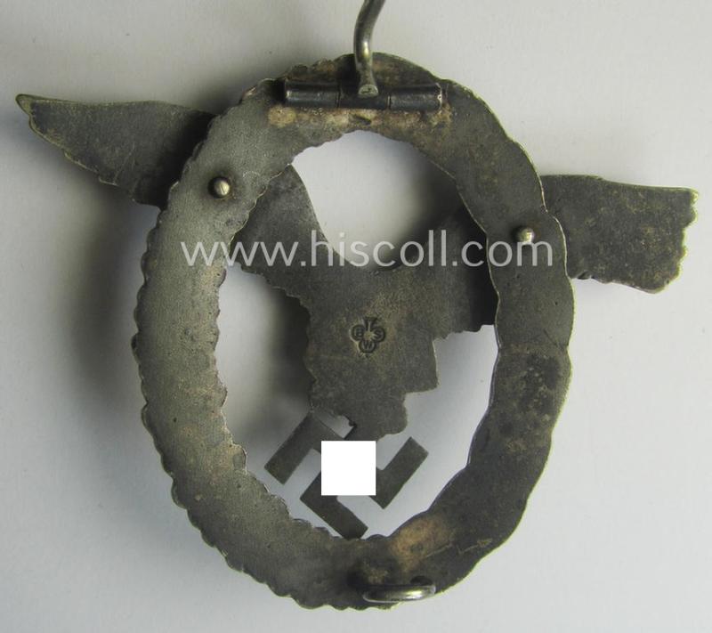 WH (Luftwaffe) 'Flugzeugführer-Abzeichen' (or: pilots'-badge) being a maker- (ie. 'BSW'-) marked- and typical 'Buntmetall'-based example as was produced by the maker (ie. 'Hersteller') named: 'Brüder Schneider' (ie. 'BSW')