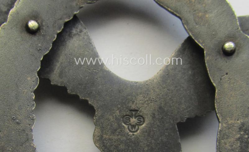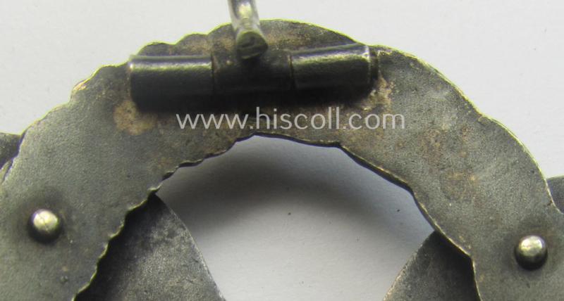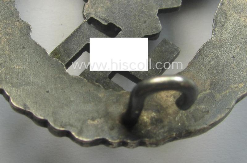 This is a truly very atractive - and actually not that easily found! - WH (Luftwaffe) 'Flugzeugführer-Abzeichen' (or: pilots'-badge) being a clearly maker- (ie. 'BSW'-) marked- and/or: typical 'Buntmetall'- (ie. 'Tombak') based example as was produced by the desirable maker (ie. 'Hersteller') named: 'Brüder Schneider' (ie. 'BSW') and that comes in an overal very nice- (and I deem just moderately used- ie. worn-), condition. The - I deem - fairly early-war-period- and/or very detailed - LW-war-badge has only been moderately worn and comes naturally mounted onto its fully functional (and fully unaltered!) pin- and/or functional catch (ie. typical catch set-up). The award shows a 'separately'- (and/or very detailed!) silverish-blue-coloured eagle-device attached (by means of two firmly attached- and totally unaltered rivets (as is visible on the back). The badge truly retains most of its period-applied (somewhat 'glossy') finish as is more often found on by 'BSW'-produced LW-war-badges. The badge shows a clear makers'-designation (being of the so-called: 'micro clover-leave mark') and is thus in all respects an example that can be attributed to the desirable Austrian maker: 'Brüder Schneider' based in the town of Wien (ie. Vienna): the award shows naturally all the specific details as known for a genuine badge by this particular maker. The piece is just minimally stained ie. dirty but has never been cleaned: the bright silver-coloured wreath and/or somewhat darker-coloured eagle-device both retain a very nice and only minimally tarnished appearance. The badge originates from a private-household in Germany where it was recently uncovered and was as such most certainly awarded, worn- and/or stored as such for decades. I deem that I have priced this truly attractive piece accordingly!
