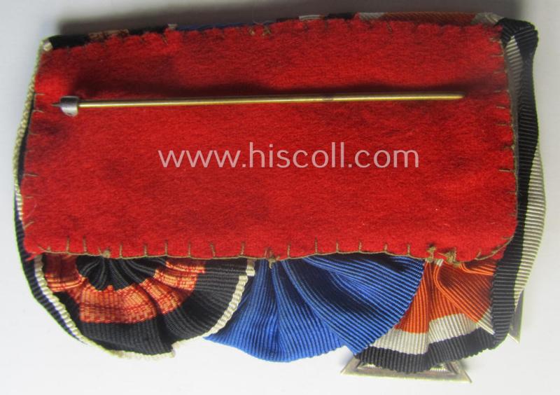 The truly attractive - and very nicely preserved! - three-pieced, (WWII- ie. TR-period) medal-bar (ie. 'Ordenspange') shows respectively an: 'Eisernes Kreuz II. Klasse' (or: iron-cross second class) being a very desirable example that was produced by the 'Juncker'-company, a: 'WH (Heeres o. Kriegsmarine) Dienstauszeichnung 4. Stufe für 4 Jahre treue Dienste' (or: loyal-service medal for 4 years of loyal service) that comes with a detailed, bright-silver-coloured eagle-device firmly attached and a: 'Medaille zur Erinnerung an den 1. Oktober 1938' was awarded to all members of the armed forces that participated in the German occupation of Czechoslovakia that started on: '1. Oktober 1938', all three awards coming in an overall very nice- (and I deem only moderately used- and/or worn-), condition. All three awards are truly nicely preserved examples that seem to have never been cleaned nor polished: they come in an equally minimally tarnished- ie. dusty (ie. used) condition and come naturally mounted on their period ribbons. The iron cross - which is an attractive example that was I deem with certainty produced by the desirable maker (ie. 'Hersteller') named: 'C.E. Juncker' as was based in the town of Berlin - was with certainty never cleaned and has a very nice and/or attractive age-patina: it retains only some of its so-called: 'hochpolierte Kanten' (or: polished sides) and has just a minimally tarnished appearance (as can be seen on the pictures). The cross retains truly very nice and/or pronounced detail and has a very nicely preserved, black-finished (ie. somewhat 'matted'- ie. satin-like) core: it is totally void of any paint-damage or alike. The WH loyal-service medal is a truly very nicely preserved example that seems to have never been cleaned nor polished: it comes in a minimally tarnished- ie. dusty condition and shows a neat (silver-toned) eagle-device period-attached. The Czech 'Anschluss'-medal: '1. Oktober 1938' - which is a neat 'Buntmetall'-based specimen - has an attractive golden-bronze-coloured age-patina (simply caused by decades of storage) and was most certainly never cleaned nor polished and therefore are details and/or finish still very nice and/or crisp. The entire 'Spange' (which is of the 'non-detachable-pattern') comes naturally mounted onto its functional pin- ie. catch set-up and is nicely 'backed' with a piece of bright-red-coloured wool as is more often seen (as can be seen on the pictures). This neat medal-bar-grouping was recently found at a private-household in Germany and was never before part of a collection. The 'Spange' is most certainly a period-compiled- and/or worn piece and is NOT a post-war compilation or alike and was kept as such for decades. Simply an attractive - and truly decorative! - three-pieced medal-bar that is not that easily found and that is most certainly accordingly priced!