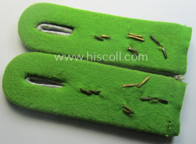 The very attractive - fully matching and actually very scarcely found! - pair of WH (Heeres) shoulderboards belonged to an: 'Oberleutnant u. Schützen des Panzer-Grenadier-Rgts. 64' (part of the '16. Panzer-Div.') and are typical, 'text-book'-examples of the Heeres'-type, officers'-pattern shoulderboards and have the silverish-grey- (ie. minimally 'sub-dued'-type-) 'upperdecks': they were with certainty once tunic-attached and show some minimal age, wear and/or staining (as can be seen on the pictures). The boards show the desirable bright-green- (ie. 'hellgrüner'-) coloured branchcolour (and were constructed from the 'smooth-type'- ie. 'moleskin-type'-wool as to be expected). The boards never had any tongues attached and were clearly intended as a pair of the 'sew-in'-pattern and measure approximately 11,3 cms. in length each. The boards show a matching pair of (bright golden-toned, larger-sized- and/or 'Buntmetall'-based) so-called: 'S'-cyphers, two pairs of (larger-sized, older-styled and I deem 'Buntmetall'-based) so-called: '6'- and/or '4'- numerals (ie. 'Ziffern') and a pair of (silverish-golden-toned, identically-styled and/or larger-sized) pips period-attached (as can be seen on the pictures) denoting that the officer who wore this set held the rank of an: 'Oberleutnant' (ie. lieutnant first-class) who served as a 'Schützen' within the: 'Panzer-Grenadier-Regiment 64'. It should, moreover, be mentioned that these 'Panzer-Grenadiere'-related shoulderboards are actually quite hard to come by and can easily be graded 'scarce'. Simply a very attractive WH (Heeres) shoulderboard-pair that belonged to an: 'Oberleutnant u. Schützen des Panzer-Grenadier-Rgts. 64' and that is with certainty accordingly priced!