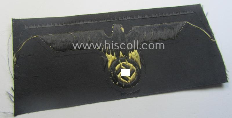 This is a very attractive - and actually not that commonly ie. truly scarcely encountered! - example of a linnen-based arm-eagle (without a towns'- or region-designation!) as was executed in the so-called: 'BeVo'-weave-style as was specifically intended for usage by an official of the: 'Deutsche Reichsbahn' (ie. member of one the various: 'Reichsverkehrsdirektionen') and that comes in an overall very nice- (ie. simply never used- nor worn- ie. 'still virtually mint'-), condition. These eagles - as woven in golden-yellow linnen on a black-coloured- and also linnen-based background - were worn on the darker-blue-coloured service-tunics and/or uniforms of the various officials within this organisation. This is a special arm-insignia-piece, that was intended for the various staff working at one of the occupied railway-centres. There were several of these railway-related centres (= 'Reichsverkehrsdirektionen' or RVD) throughout Europe. This is one of the more difficult to encounter (generic) examples of the extensive series that was intended for a 'Reichsbahn'-official serving within one of the: 'RVD' (or: 'Reichsverkehrsdirektionen'). The piece - showing a left-facing eagle as to be expected - comes in never used- ie. 'still virtually mint' condition: it is just a tiny bit stained ie. wrinkled caused by decades of storage only. Simply a very attractive - and most certainly not that commonly encountered! - 'Deutsche Reichsbahn'-related arm-eagle!
