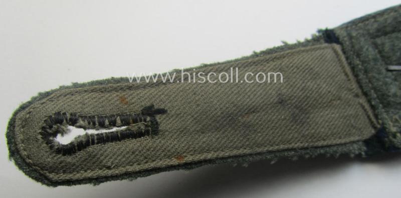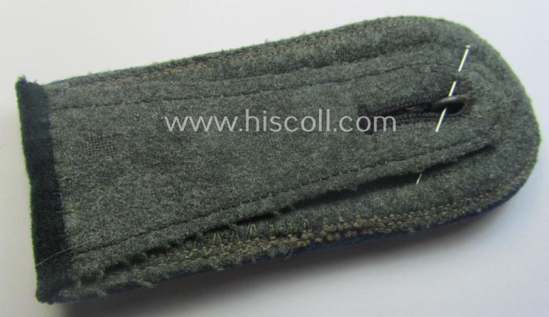 This is an attractive - albeit regrettably single but nevertheless scarcely found! - WH (Heeres) NCO-type (ie. 'M40'-pattern- and neatly 'cyphered') shoulderstrap as piped in the darker-blue- (ie. 'blauer'-) coloured branchcolour as was intended for usage for - and clearly worn by! - an: 'Oberfeldwebel u. Mitglied einer Ärztlichen Akademie' (or: senior-NCO ie. sergeant first-class who served within one of the army medical training-schools ie. 'Ärztlichen Akademien') and that comes in an overall nice- (albeit moderately used ie. worn-), condition. The shoulderstrap - which is approximately 10,2 cms. sized in length has the 'standard-type'- and/or darker-green-coloured, smooth-woolen-based 'upperdeck' (and woolen-type piping!) and shows an (aluminum-based, Gothic-styled) so-called: 'A'-cypher (or: 'Ziffer') and two (regular-sized, copper-toned) pips, period-attached (its should be noted that the 'A'-cypher has been period-fortified by means of some stitching as can be noticed on pictures). The strap - which came mounted onto its functional tongue - shows as stated above some moderate usage and/or wear (some minor staining and/or dust is visible and/or present). It should be noted that all 'cyphered'-pattern, WH (Heeres) shoulderstraps can easily be regarded 'fairly scarce'. This strap - that came together with a field-grey-toned tunic- ie. company-button that shows the numeral '21' - originates from an older shoulderstrap ie. board-collection that I recently acquired for the web-site. Simply an attractive and/or: early-war-period, neatly 'cyphered' and/or 'Heeres'-related NCO-type shoulderstrap that was intended for usage by an: 'Oberfeldwebel u. Mitglied einer Ärztlichen Akademie'!