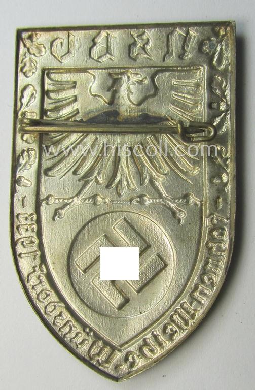 The attractive - early-period and with certainty unusually seen! - day badge (ie. 'tinnie' or: 'Veranstaltungsabzeichen') is executed in minimally tarnished, bright-silver-toned (and neatly multi-coloured!) zinc-based- (ie. pot-) metal and is depicting a detailed illustration of a detailed eagle-device and swastika coupled with the tekst that reads: 'N.S.B.O.-Fahnenweihe - Wünsdorf - 1933': it does shows some normal wear and/or minimal age. The badge comes naturally mounted onto its functional pin-ie. pin-catch set-up and has (I deem) never been cleaned nor polished: it shows some minimal staining (as can be seen on the pictures) but is still very detailed and/or pronounced (it retains a fully-preserved painted ie. sprayed surface as can be noticed on the pictures). The 'tinnie' is totally void of a makers'-designation and retains most of its (fairly shiny!) silver-coloured (ie. chromed) finish and just shows some minimal age ie. staining. Simply a neat - and with certainty not that often observed! - N.S.B.O.-related 'tinnie' that is I deem, accordingly priced!