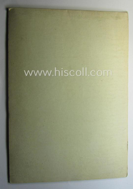 This is a neat - surely desirable and fully complete! - WH (Heeres ie. Luftwaffe etc.) (I deem) 'souvenir-related' cover showing on its front an illustration of the: 'Rathaus der reichsdeutschen Stadt Danzig' coupled with the (golden-toned) text: 'Feldpostbriefe' that is holding a full set of (minty) 'Feldpost'-letters and that comes in a hardly used- (ie. still 'virtually mint'!), condition. The 'notebook' measures 20,5 x 14,5 cms. and holds approximately 25 examples of (minty) 'Feldpost'-letters (as can be seen on the pictures). The neat piece comes in a wonderful condition and is just a tiny bit yellowed- ie. stained due to decades of storage only. Simply an attractive personal-equipment accesory that can excellently be used for storage into any WH-map-case (ie. 'Kartentasche'): ideal for any mannequin set-up. Incredible that such a fragile item was kept in such untouched condition for all those years!