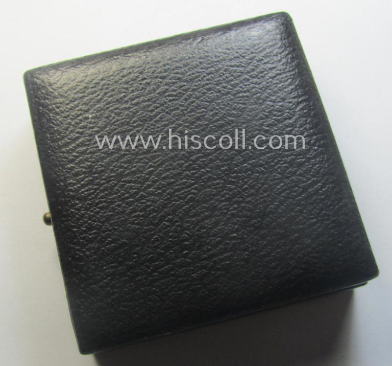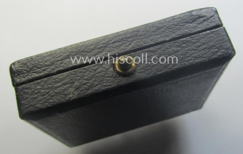 The truly attractive - and luxuriously-styled! - golden-class wound-badge (or: 'Verwundeten-Abzeichen in Gold') is executed in neat and/or fairly shiny, so-called: 'Buntmetall' and shows only moderate usage and/or minimal wear (as can be clearly seen on the pictures). The attractive wound-badge comes naturally mounted onto its fully functional and typically 'broad'- (ie. 'flat'-) shaped pin and has a totally unaltered (and naturally fully functional) catch ie. catch-set-up. The wound-badge has most certainly never cleaned and retains most (ie. almost all!) of its golden-toned (ie. 'feuervergoldeter') finish. It only shows some minimal tarnish (and has never been cleaned nor polished). It is - as stated above - showing a clearly present '30' -makers'-designation (something that is more often but not always the case). The black-coloured- (simulated leather-based- and/or: partly wooden-based) etui - comes also in an overall very nice, albeit moderately used, condition (it is just somewhat dusty ie. dirty simply caused by years of storage but totally void of any real damage or alike). The etui - that also shows a 'Hautmünzamt'-sticker glued onto its back - has a beige-coloured (simulated 'velvet') interior: this inlay shows a clear imprint of the wound-badge and (that was most certainly stored in this manner for decades). This attractive WB was recently found as such at a private-household in Germany and can naturally be attributed to the Austrian maker (ie. 'Hersteller') named: 'Hauptmünzamt' as was based in the town on Wien ie. Vienna (as can be seen on the pictures). Simply a very attractive and with certainty desirable, golden-class WB-set (of the very desirable 'flat-shaped pin-pattern'!) that is nowadays most certainly not that easily encountered!
