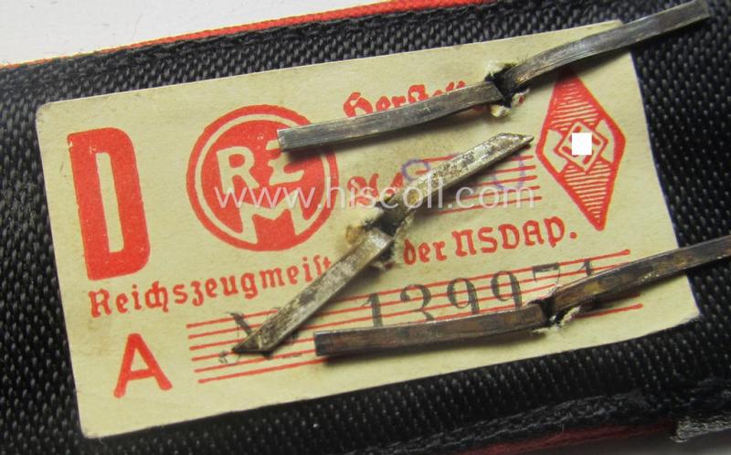 This is a truly attractive - actually not that easily found and/or fully matching! - pair of bright-red-piped, so-called: 'Allgemeine- HJ' (ie. Hitlerjugend) shoulderstraps as was specifically intended for usage by a: 'Hauptgefolgschaftsführer' who served within the Austrian-based: 'Bann 565' (565 = 'Bann Spittal') as was situated in the 'Gebiet Südost Kärnten' and that comes in an overall nice- (I deem used- and/or carefully tunic- ie. shirt-removed-) condition. Both straps - of which one strap still retains its period-attached 'RzM'-etiket as more often - are executed in black-coloured linnen, having the bright-red-embroidered '565'-numerals (ie. 'Ziffern') and/or bright-red-coloured- (and/or rayon-based-) piping attached as to be expected. The straps never had any tongues attached (they were clearly used as a pair of the 'sew-in'-pattern) and come as found and/or issued. The straps measure 11 cms. in length each as usually encountered and show both some minimal age, wear and/or staining, I deem simply caused by decades of storage and/or truly minimal wear. The pair shows three (typical smaller-sized, bright-silver-toned) rank-pips and two stripes of (typical) HJ-rank-braid period-attached denoting the (truly unusually seen!) rank of a: 'Hauptgefolgschaftsführer'. Simply a very attractive - and quite scarcely encountered! - pair of 'Allgemeine HJ'-straps that belonged to a: 'Hauptgefolgschaftsführer' who served within the Austrian-based 'Bann 565' (565 = 'Bann Spittal') in the 'Gebiet Südost Kärnten')!