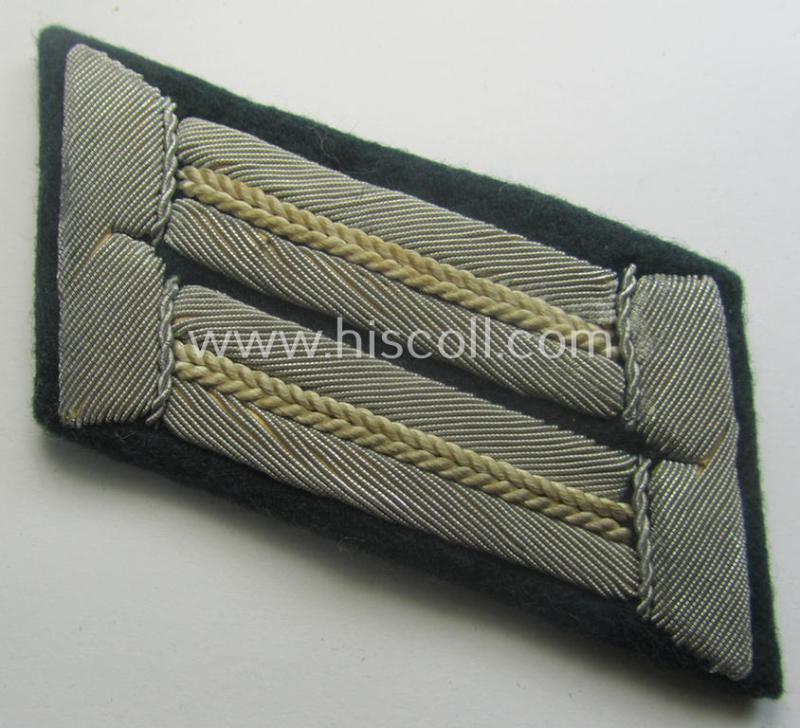 This is a very attractive - fully matching and I deem simply never used- nor tunic-attached! - pair of 'standard-issue'-pattern', neatly hand-embroidered officers'-type collar-tabs (ie. 'Kragenspiegel für Offiziere des Heeres') as piped in the desirable white- (ie. 'weisser'-) coloured branchcolour as was specifically intended for usage by an: 'Offizier eines Infanterie-Regiments' (or: officer who served within an army infantry-regiment ie. unit) and that comes in an overall very nice- (ie. simply never worn- ie. 'virtually mint'), condition. The white-piped pair - that shows the typical buckram-based 'backing' - is constructed from darker-green-toned- (and truly 'smooth'-type!) wool and is - as to be expected - neatly hand-embroidered in silverish-grey-toned 'braid' (as can be seen on the pictures). Simply an attractive Heeres-collar-tab-pair that was intended for an: 'Offizier der Infanterie-Truppen' and that will be hard to be upgraded!