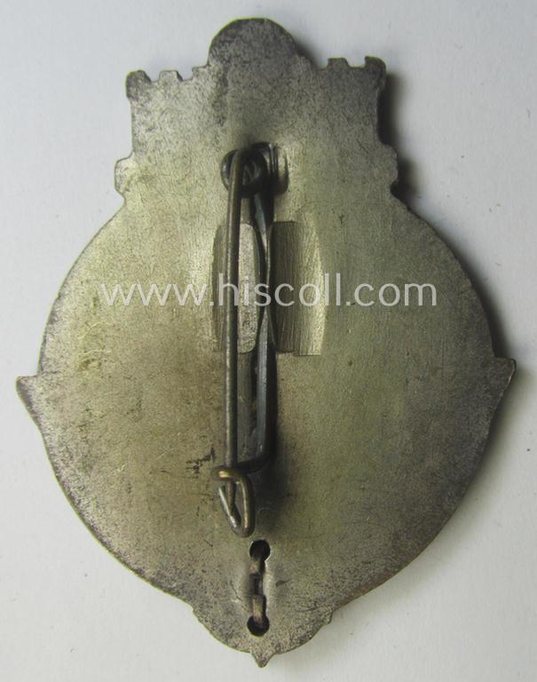 This is a very attractive - and actually very rarely encountered and truly luxuriously styled! - HJ- ie. BDM (ie. 'Hitlerjugend' or: 'Bund Deutscher Mädel') related, commemorative day-badge (ie. 'tinnie' ie. 'Veranstaltungsabzeichen') being a bright-silverish-toned- and light-weight, (I deem) zinc- ie. 'Feinzink'-based example as was issued to commemorate a specific (national!) youth-rally ie. gathering named the: 'Reichsberufs-Wettkampf der Deutschen Jugend' that was held in the year 1938 and that is entitled: 'Reichskampf Hamburg 1938' and that comes in an overall very nice- (albeit surely issued ie. moderately worn-), condition. The very detailed and/or pronounced badge truly shows extraordinary detail and was almost certainly never cleaned nor polished. The - as more often non-maker-marked - piece shows a detailed illustration of the Hamburg-based tower (ie. 'Hamburger Tor') and eagle-device (holding a so-called, enamelled: miniature 'HJ-Raute') with above that the years'-designation (1938) and (Gothic-styled) text as mentioned above. The badge comes naturally mounted onto its (functional and totally unaltered) pin-/catch set-up. Simply a very attractive - and with certainty rarely seen! - youth-related 'tinnie' ie. 'Veranstaltungsabzeichen' that is truly not that often offered for sale!