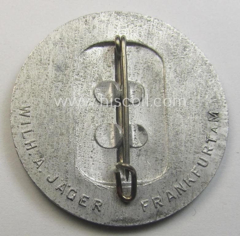 The attractive - and with certainty scarcely encountered! - circular-shaped day-badge (ie. 'tinnie' or: 'Veranstaltungsabzeichen') is executed in bright silver-coloured- and/or aluminium-based metal: it shows some regular wear and/or moderate age but is totally void of any real damage or alike. The badge (having an approximate diameter of 3,7 cms.) comes mounted onto its functional pin- ie. catch set-up and has never been cleaned nor polished: it shows some minimal age ie. staining (as can be seen on the pictures). The 'tinnie' is quite detailed and retains most of its somewhat tarnished, silverish-grey-coloured finish. The 'tinnie' - which is clearly maker- (ie. 'Wilh. Jäger - Frankfurt a. M.'-) marked on its back - depicts two side-portraits (of a youngster and 'SA-Mann') and shows so-called 'HJ-Raute' (as can be seen on the pictures). It shows the text that reads: '2. Gebietsaufmarsch - Nordsee (7) Bremen - 1937' and is sub-titled: 'Nordsee HJ Dankt der alten Garde'. The neat piece comes as stated above mounted on its functional pin- ie. catch set-up. Simply an attractive - and with certainty scarcely encountered - 'HJ'- (ie. 'Hitlerjugend'-) related 'Veranstaltungsabzeichen' issued to commemorate participation in the: '2. Gebietsaufmarsch - Nordsee (7) Bremen' as held in the year 1937!
