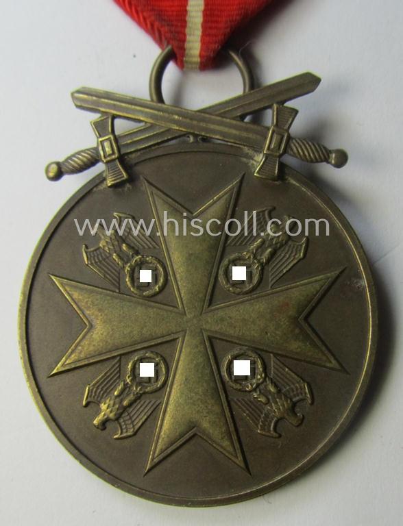 This is an attractive - and actually truly scarcely found! - example of a so-called: 'Deutsche Bronzene Verdienstmedaille des Deutschen Adler Ordens mit Schwertern' (or: bronze-class merit medal of the German Eagle Order with swords) being a nicely maker- (ie. '30'-) marked example that shows the clear makers'-designation: '30' stamped into its ring and that comes in an overall very nice- (ie. I deem probably issued albeit I deem hardly used- nor worn-), condition. The truly very detailed and nicely preserved example is executed in somewhat darker, bronze-toned metal and came mounted onto its full-length (and neatly confectioned- ie. 9 cms.-sized) ribbon (ie. 'Bandabschnitt') which piece is actually scarcely found by itself. This ribbon also retains its bronze-toned 'clip' (intended to attach the award to a tunic). The piece retains gorgeous details and was naturally never cleaned nor polished. As stated above, does this example bear a clearly stamped makers'-designation: '30' into its ring signifying that it deals with a piece that was produced by the Austrian-maker (ie. 'Hersteller') named: 'Hauptmünzamt' based in the town of Wien (ie. Vienna). Simply a fantastic example of a: 'Deutsche Bronzene Verdienstmedaille des Deutschen Adler Ordens mit Schwertern' that will be very hard to be upgraded and that comes not that often for sale!