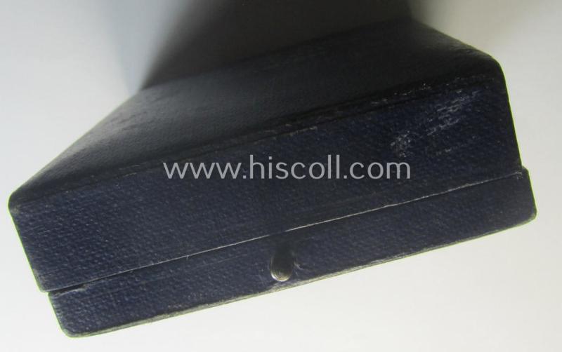 This is a truly attractive - complete, fully untouched and I deem just moderately used- and/or worn! - example of a: WH (Luftwaffe) 'Fliegerschützen-Abzeichen mit Blitzbündel' (or: Luftwaffe airgunners-war-badge with lightning-bolts) being a neatly (albeit somewhat vaguely) maker- (ie. 'Wilh. Deumer - Lüdenscheid'-) marked- and/or: typical zinc- (ie. 'Feinzink'-) based example as was produced by the: 'Wilh. Deumer'-company as based in the town of Lüdenscheid and that came stored it its period (luxuriously-styled!) etui as issued and that comes in an overall very nice- (and just moderately used- ie. worn-), condition. The (I deem) mid- (ie. later-) war-period award ie. war-badge comes in a just moderately worn condtion and comes naturally mounted onto its fully functional (and fully unaltered!) pin- and/or functional catch (ie. typical catch set-up). The award shows a 'separately'- (and/or detailed!) greyish-silver-coloured eagle-device attached (by means of two firmly attached- (and unaltered!) rivets (as is visible on the back). The badge retains most of its period-applied greyish-toned finish but does show a tarnished- (ie. typical zinc-like-) age-patina as is more often encountered on these Luftwaffe-related war-badges. The badge shows a somewhat vaguely (but surely present!) makers'-mark-designation (ie. 'Wilh. Deumer - Lüdenscheid') and is in all respects thus an example that can be attributed to the desirable maker: 'Wilhelm Deumer' as was based in the town of Lüdenscheid: the award shows naturally all the specific details as known for a genuine, air-gunners-badge by this particular maker. The piece is just minimally stained ie. dirty but has I deem never been cleaned: both wreath and/or eagle-device retain a nice albeit minimally tarnished appearance. The award came stored it its period (luxuriously-styled!) etui that comes in an equally nicely preserved condition. The etui shows a (fully present) velvet-like interior and shows on its lid the (silverish-golden-toned and complete) text that reads: 'Luftwaffen-Fliegerschützen-Abzeichen' (as can be noticed on the pictures). The set originates from a private household in Germany and was never part of a collection. I deem that I have priced this attractive (and completely untouched!) piece according to its comparative scarcity and/or desirability!