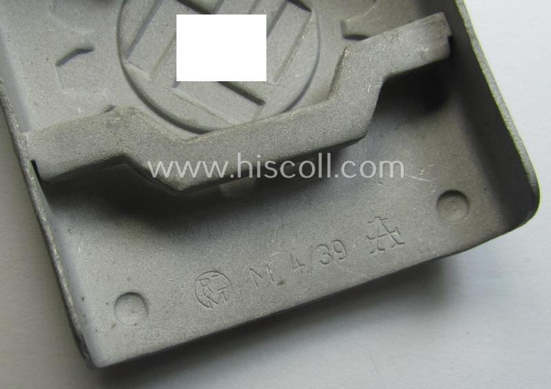The truly attractive - and as always aluminium-based- (and still neatly 'anodised'!) belt-buckle retains allmost all of its (somewhat 'matted'!) greyish-silver-toned finish and comes in a simply never worn- nor used condition: it does show some minimal age ie. staining simply caused by decades of storage and/or handling over the years but was - I deem - never cleaned nor polished. The buckle - that comes mounted onto its typical 'cranked'-catch - is nicely (and clearly!) maker-marked with a makers'-designation (ie. 'A'- or: 'Assmann u. Sohne'-logo) and bears additionally an: 'RzM M4/39'-marking (which markings are both visible on the back of the buckle as can be seen on the pictures). The buckle - which truly retains pronounced detail - orginates from an older belt-buckle-collection that was compiled over many years and that I acquired for the web-site. Simply a very attractive - and 'virtually mint'! - 'DAF' (ie. 'Deutsches Arbeitsfront') ie. 'Werkschar'-related belt-buckle that is most certainly accordingly priced!