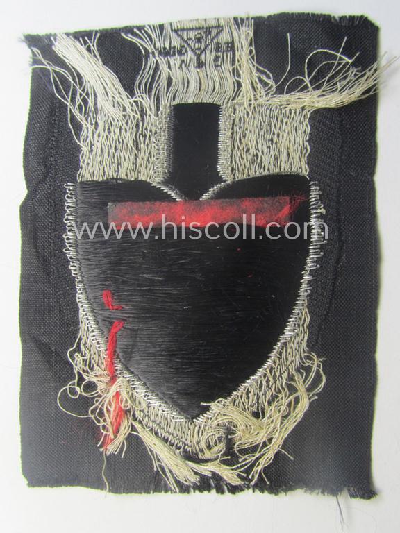 This is a very attractive - and actually very scarcely encountered! - officers'-type version of a so-called: RAD (ie. 'Reichsarbeitsdienst') sleeve-badge (or: 'Dienststellen-Abzeichen') bearing the specialist-designation: 'M' (as was intended for a senior RAD-official with the truly not that often seen function of: 'Hauptmeldebeamter' (or: senior-communications-official) and that comes in an overall nice- (ie. I deem probably issued- albeit simply never tunic-attached-), condition. These badges were worn on the upper-left sleeve of the mustard-coloured (officers'-type-) RAD-tunics and/or garments. The badge - which shows the red-coloured 'M'-character - is neatly executed in so-called 'flat-wire'-like-'BeVo'-weave technique. The piece was never folded nor trimmed and can be easily be graded as 'virtually mint' as to be expected. The badge is neatly maker-marked and displays the interwoven so-called: 'Ges.Gesch.'-designation as is more often found on RAD cloth badges- and/or insignia. This badge originates from a smaller collection of rarely seen RAD cloth-insignia I recently acquired for the web-site. It should be noted that all RAD officers'-type badges are comparatively scarcely encountered: those intended for specialised functions even more so!