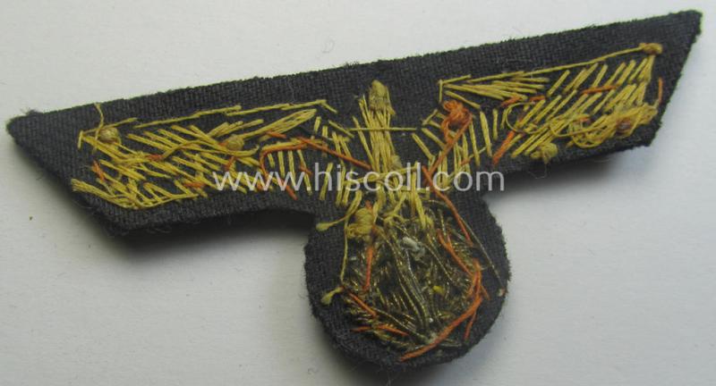 This is an unusual - and with certainty not that often found! - example of a WH (Kriegsmarine) officers'- (ie. evt. NCO-) type, hand-embroidered- (and truly very detailed!) naval-type visor-cap-eagle (ie. 'Schirmmützenadler für Offiziere der Kriegsmarine') being executed in various types of bright-golden-coloured braid (and/or non-'Cellueon'-based material!) onto a darker-blue-coloured- and/or 'smooth'-woolen-based background and that comes in an overall very nice condition. This eagle - having a length ie. 'wingspan' of approximately 7 cms. - is very nicely hand-embroidered using the neat golden-coloured 'braid' onto a darker-blue-coloured (and/or woolen-based-) background and has some 'highlighted areas' as executed in orange-coloured, linnen-based material (as can be seen on the pictures). The eagle was most certainly used- ie. once cap-attached (by hand-stitching) and still shows some of it stitching-remains (as can be seen on the pictures). The eagle can naturally easily be used as a scarcely found replacement piece if needed. In any case is this a neat example of a WH (Kriegsmarine) officers'-type 'Schirmmützenadler' of the 'Extra Qualität'!