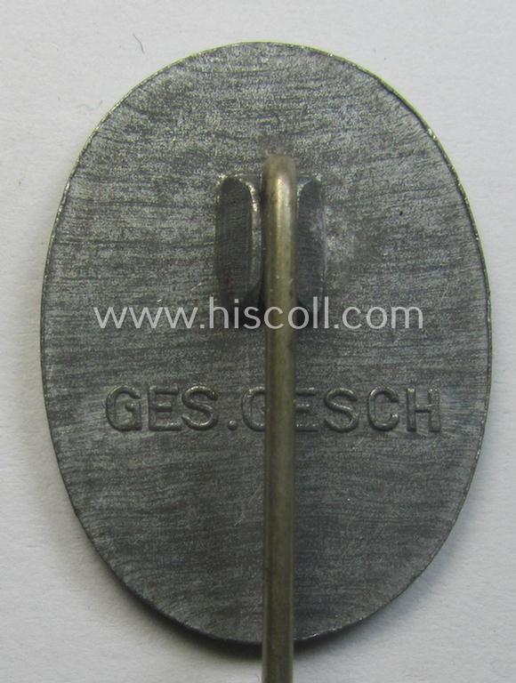Multi-coloured- and/or 'molded'-styled, aluminium-based lapel-pin (aka: 'RAD-Erinnerungsnadel') being a non-marked example that shows a: 'Ges.Gesch.'-designation as was intended for the: 'Reichsarbeitsdienst der Männer (RAD/M)'