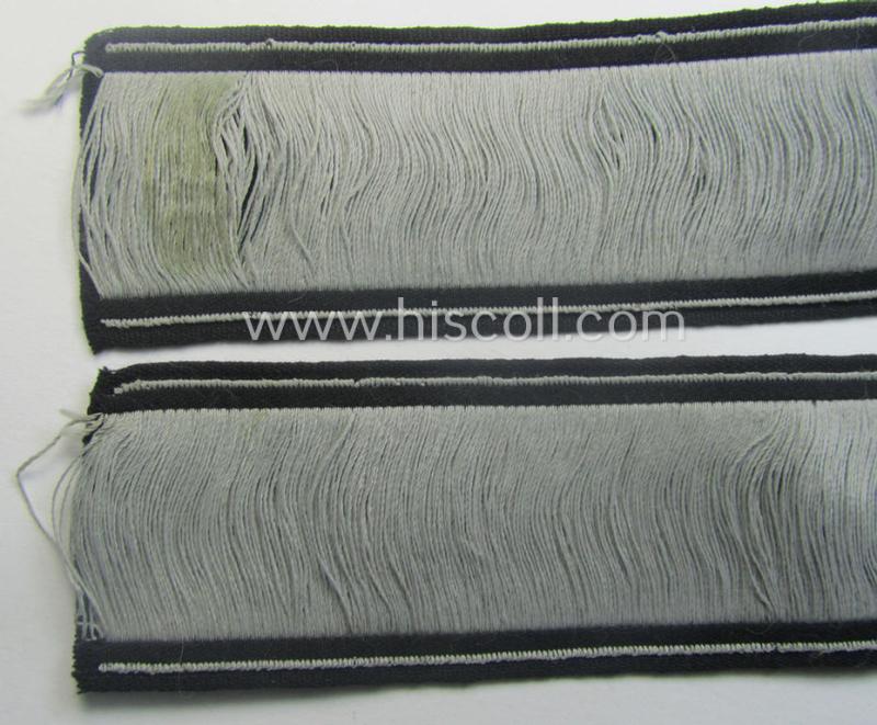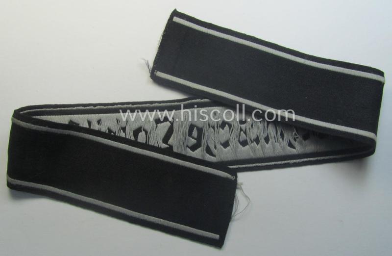 This is an attractive - I deem just minimally used and/or carefully tunic-removed and actually scarcely encountered! - example of a cuff-title (ie. 'Ärmelstreifen') entitled: 'Technische Nothilfe' (= 'TeNo') being an example as woven in the neat 'BeVo'-weave pattern and that comes in an overall very nice- (ie. I deem most certainly used- and/or carefully tunic-removed-), condition. The cuff-title is executed in greyish-blue-coloured linnen as interwoven on a black-coloured (and also linnen-based) background. The piece comes in a full-length (and not sewn-together) condition and measures approximately 43 cms. in length (and having a to be expected width of 4 cms.). As usually encountered are both ends 'unfinished' and do show some minor fraying as to be expected. The armband does show some minimal age, wear and/or staining simply caused by fair wear and/or decades of storage. Simply and attractive - truly used and naturally genuine! - 'TeNo'-cuff-title that will be hard to be upgraded!