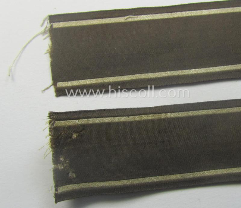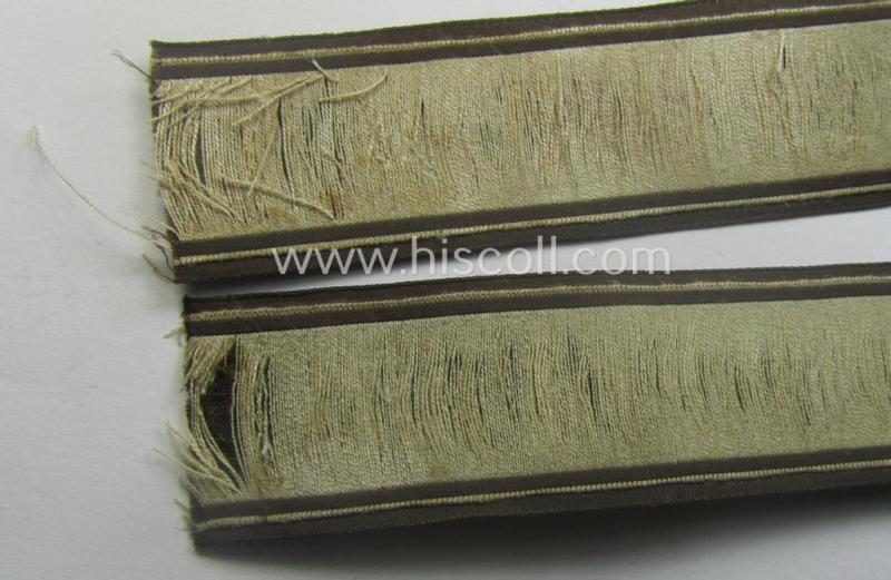 This is an attractive - and with certainty very rarely encountered! - example of the HJ/BDM- ('Hitlerjugend' ie. 'Bund Deutscher Mädel'-) related cuff-title (ie. 'Ärmelstreifen') entitled: 'BDM-Osteinsatz' (or: BDM eastern-action) being an example as executed in the neat 'BeVo'-weave pattern and that comes in a just minimally used- (and I deem clearly tunic-removed-), condition. The cuff-title - which comes in a (I deem) non-shortened- ie. full-length condition and measures now approximately: 39 cms. in length - is woven in the neat 'BeVo'-weave pattern in greyish-white-coloured linnen onto a golden-brownish-coloured- (and/also linnen based) background. These rarely encountered BDM-cuff-titles were worn on the lower left sleeves and were awarded to BDM-members who served as volunteers in the occupied Eastern-Territories. The piece is (I deem) clearly tunic-removed and shows some minor age, wear and/or staining (as can be seen on the pictures). The piece is also a tiny bit wrinkled and/or stained and shows the obvious signs of having been once tunic-attached. Simply a very rare encountered - and most certainly desirable! - female-youth-related cuff-title which is with certainty not that often offered for sale!