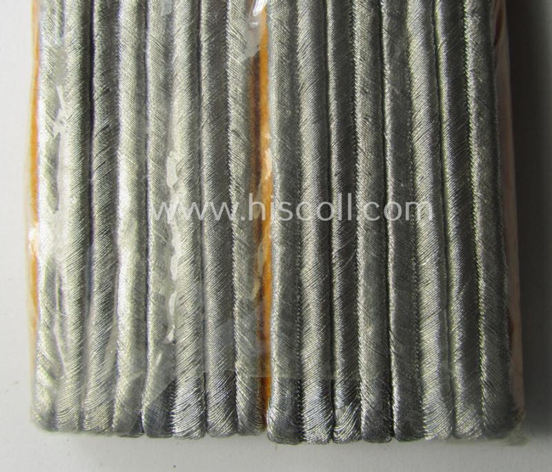 The very attractive - and with certainty unusually seen! - pair of WH (Luftwaffe), officers'-type shoulderboards is neatly piped in the typical golden-yellow- (ie. 'goldgelbener'-) coloured branchcolour and was as such intended for usage by a junior-officer holding the rank of a: 'Leutnant der Flieger- o. Fallschirmjäger-Truppen' (or: lieutnant who served within a pilots'- ie. paratrooper-regiment or unit) and that comes in an overall very nice- (I deem simply never used- nor worn- ie. still 'virtually mint- ie. issued'-), condition. The boards have the (bright) silverish-coloured 'upperdecks' something that is to be expected with a Luftwaffe-pattern pair (as can be noticed on the pictures). The boards show the desirable golden-yellow- (ie. 'goldgelbener'-) coloured branchcolour (and were constructed from the typical 'smooth'-type wool as to be expected). The boards come mounted onto their (typical smaller-sized) officer-type tongues attached. The boards measure approximately 11 cms. in length each and were possibly issued- but simply never worn and do just show some storage-age ie. staining as to be expected. The pair - that was recently found at a German private-household. Of additional interest is, moreover, the fact that this truly 'minty' pair came still packed in its period (typical 'Cellophan'-based!) 'wrapping-pouch' (as can be noticed on the pictures). Simply a very attractive - and desirable! - WH (Luftwaffe), officers'-type shoulderboard-pair that was intended for usage by a: 'Leutnant der Flieger- o. Fallschirmjäger-Truppen' and that will be impossible to be upgraded!
