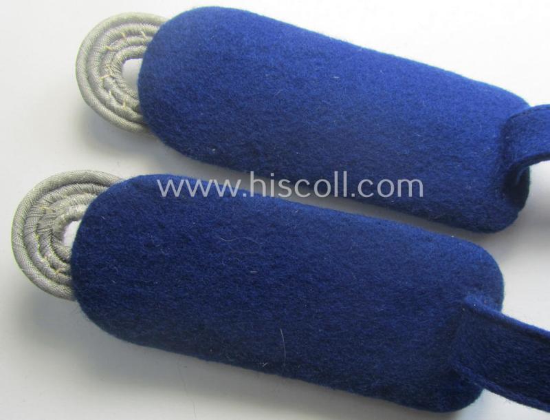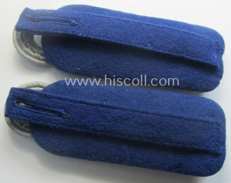 The attractive - and fully matching! - WH (Heeres) shoulderboard-pair is piped in the typical darker-blue- (ie. 'blauer'-) coloured branchcolour: as such, the pair was intended for usage by a senior army-officer ie.: 'Major u. Arzt' (ie. major and medical-doctor) who served within the: 'Heeres-Sanitäts-Truppen' (or: army-related, medical-troops). The pair was most certainly issued and worn as such but comes, nevertheless, in an overall very nicely preserved and/or fully untouched, condition. The somewhat smaller-sized shoulderboards - which are constructed from the darker-blue- (ie. 'blauer'-) coloured, 'smooth-type' (ie. moleskin-like-) wool - come in an excellent condition overall and will be hard to be upgraded (the pair is fully matching as can be seen on the pictures). The somewhat 'sub-dued' appearance of the 'upperdecks' is fully present and/or preserved (something that is to be expected for a 'Heeres'-related shoulderboard-pair). The boards are just a tiny bit 'tarnished' by normal age and/or storage for decades (as can be seen on the pictures). The boards - which measure approximately 10,3 cms. in length each - show a matching pair of the neat (golden-toned, I deem 'Buntmetall'-based- and/or smaller-sized) so-called: 'Aesculapus'-cyphers period-attached denoting the officers'-rank ie. function of: 'Major u. Arzt der Sanitäts-Truppen'. The straps come mounted onto their (smaller-sized) officers'-type tongues (as can be seen on the pictures). The straps do only show some moderate age and/or wear and are truly void of any damage or alike. Of additional interest is, moreover, the fact that all both devices were attached BEFORE the boards were fully assembled. This attractive pair originated from a small lot of 'cyphered' shoulderstraps and boards that I recently acquired for the web-site: it should, moreover, be noted that all 'cyphered' boards are quite hard to find. Simply a great occasion to acquire an attractive, officers'-type (and fairly high-ranked!) Heeres shoulderboard-pair that was intended for a: 'Major u. Arzt' who served within the: 'Sanitäts-Truppen'!